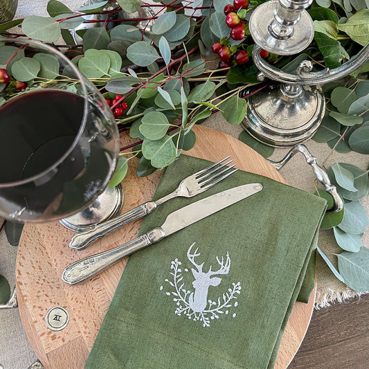Stag with Holly Berries Linen Tri-Fold Napkin