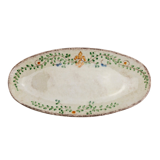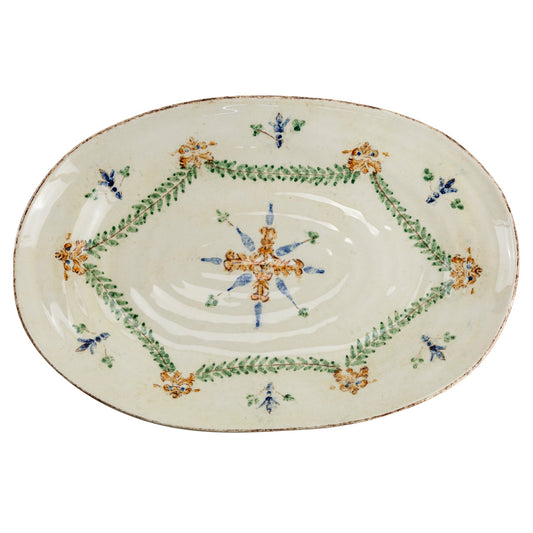 Beautiful handmade and hand painted Italian ceramic with a Renaissance inspired design in rich hues of green, blue and orange. A popular Thanksgiving pattern.