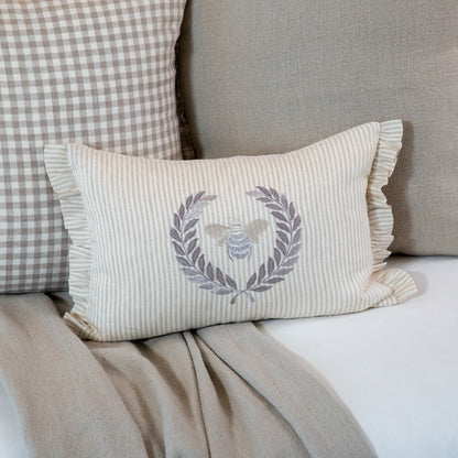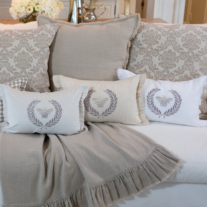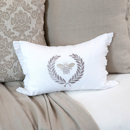 Add a touch of elegance and style to your home with a 100% European Linen decor pillow embroidered with "Bumble Bee". Pillow comes 13" x 19", has a zippered opening and filled with hypoallergenic synthetic down fill. Pillow comes with a ruffle edge. Machine wash, lay flat to dry and easy iron for best look.