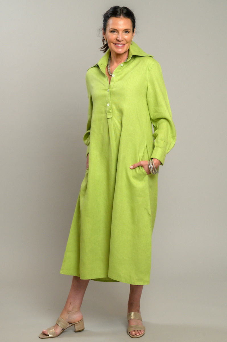 Experience luxury and comfort with the Coco Linen Dress! Featuring a midi length and accentuated collar, this dress exudes sophistication. The button-down placket and cuffed arms add a touch of refinement, while the flowy design will keep you feeling cool and stylish throughout your day. So much more than just a basic dress!