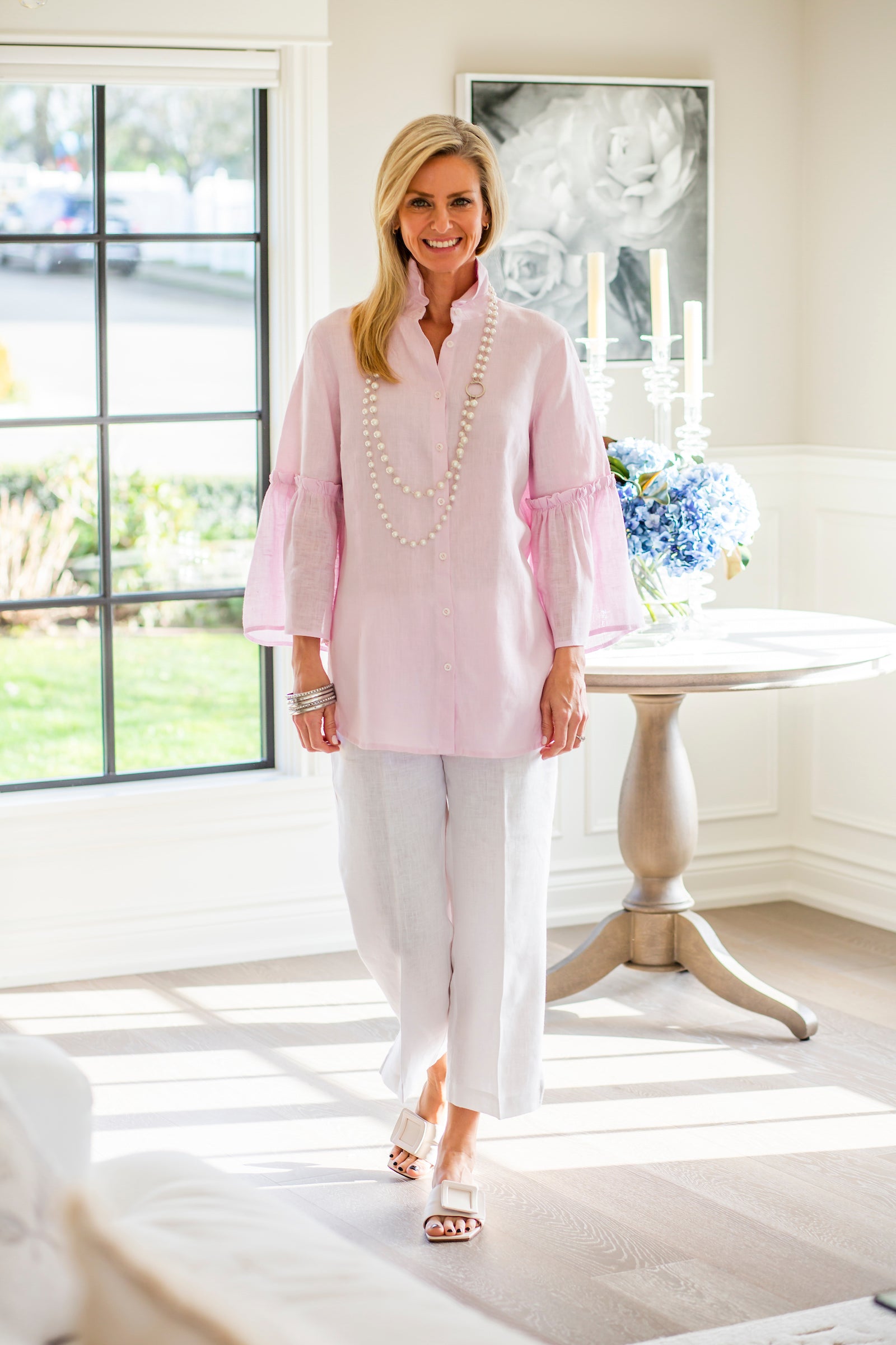 A fun twist on a classic button up top. A flowy lightweight ruffle sleeve from elbow to wrist adds style and fun to this classic piece.