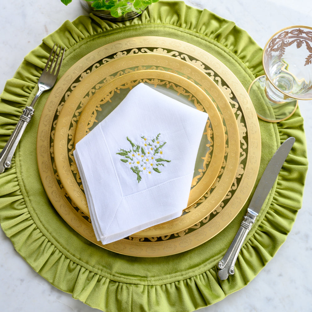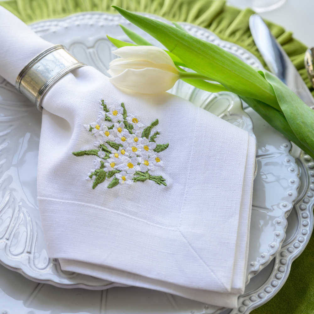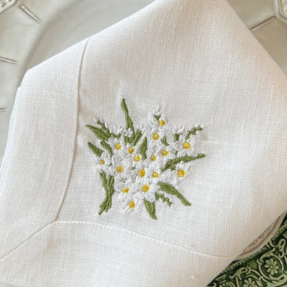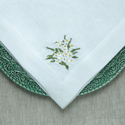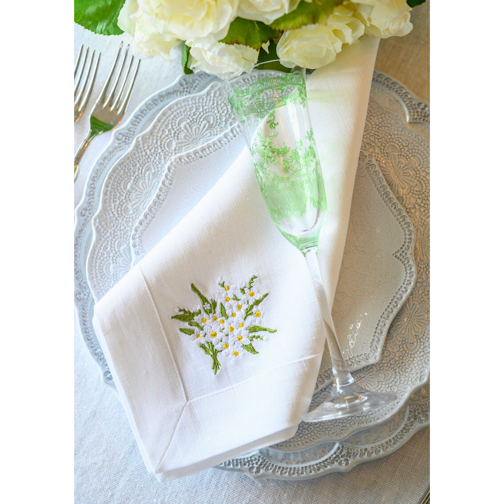 Crown Linen Designs 100% European linen napkins are a perfect mix of elegance and beauty. Combine with a runner, table topper or placemats to finish off the look. Each napkin is embroidered with a "Daisy Bouquet" on one side corner. Machine wash and lay flat to dry for a soft and comfortable look. Iron if desired for a more formal appeal. Size 22"x22".