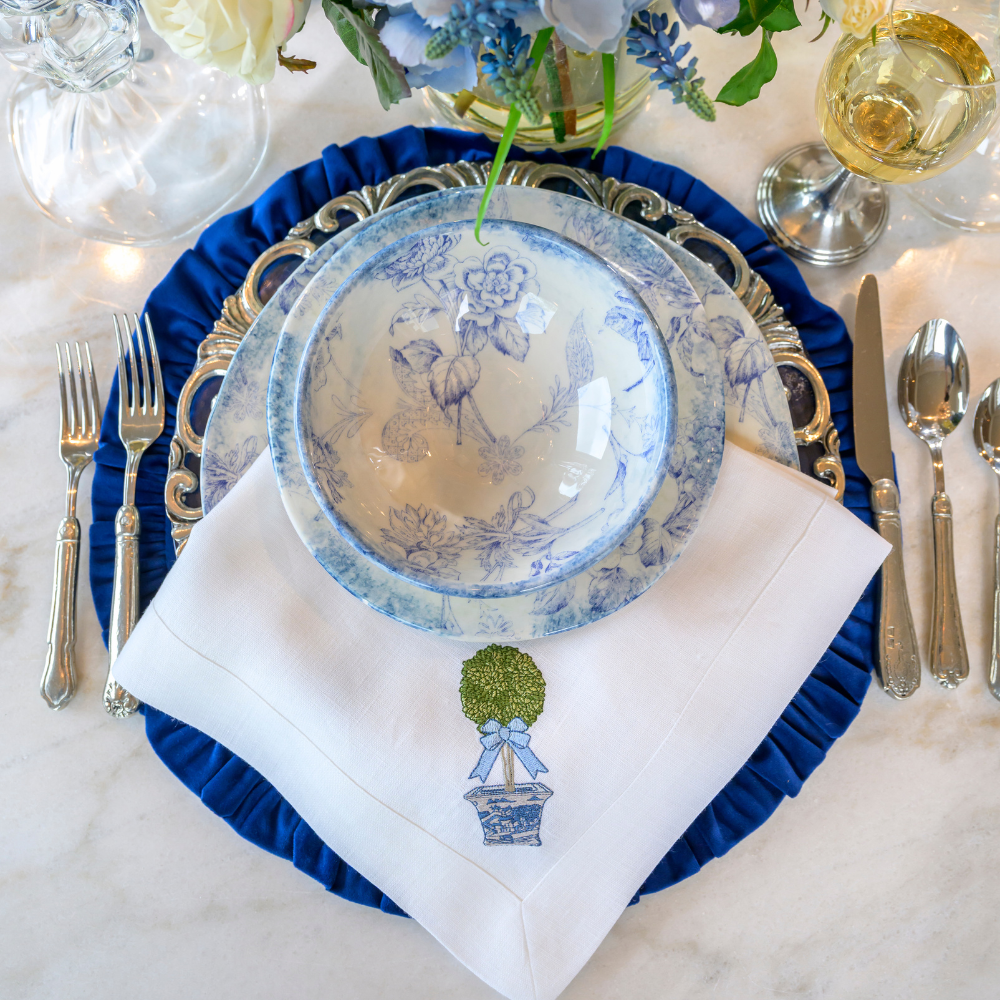 Our Giulietta Collection, light, beautiful and romantic is the result of truly extraordinary artistry. The design is applied to the ceramic by hand, fired and then hand painted with a sponge before being fired a second time. Little wonder it is so fair! Offered in both blue and gray. Hand made in Tuscany.