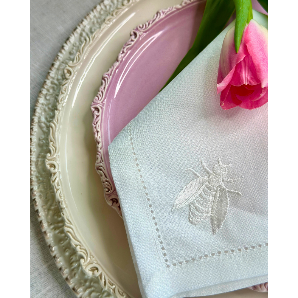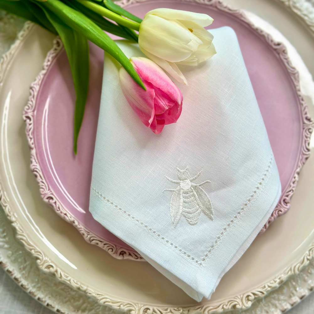 This beautiful new hemstitch bee embroidered Italian linen napkin is a beautiful complement to any table setting. Each napkin measures 20"x20"