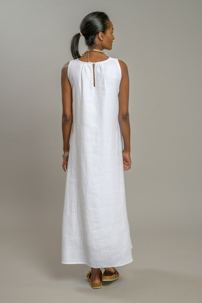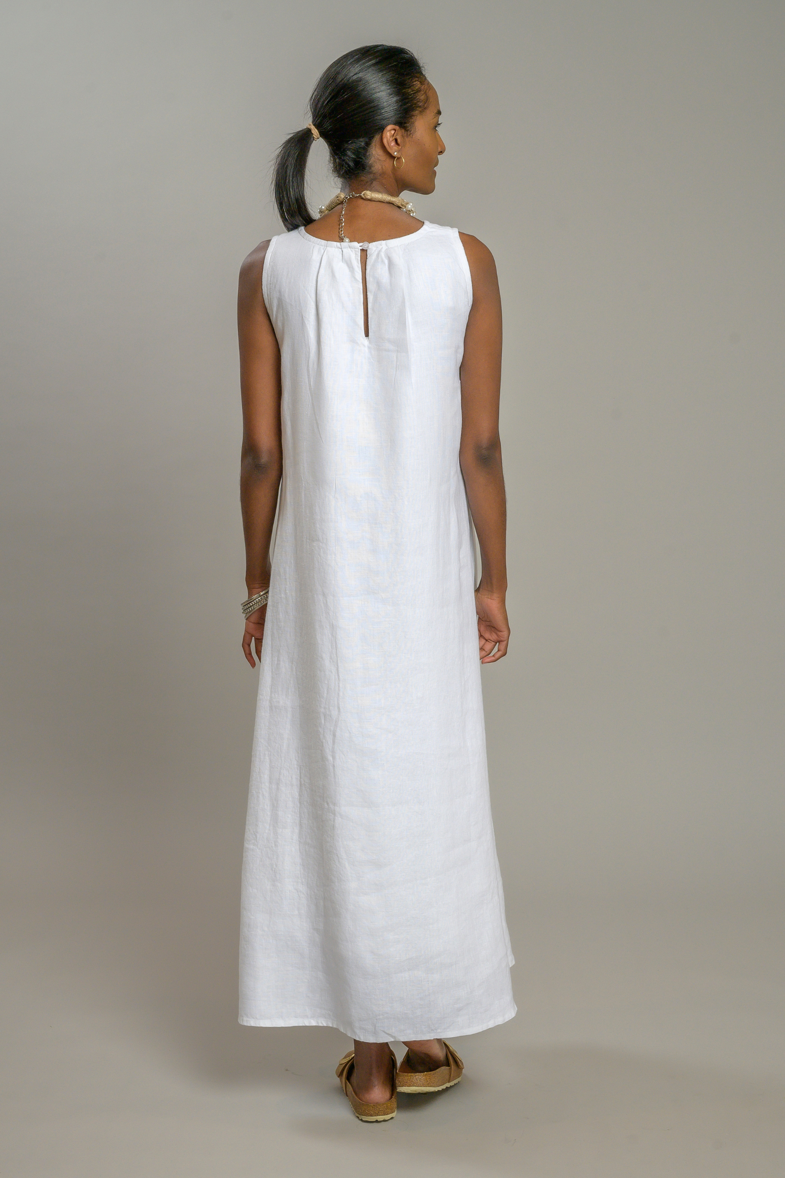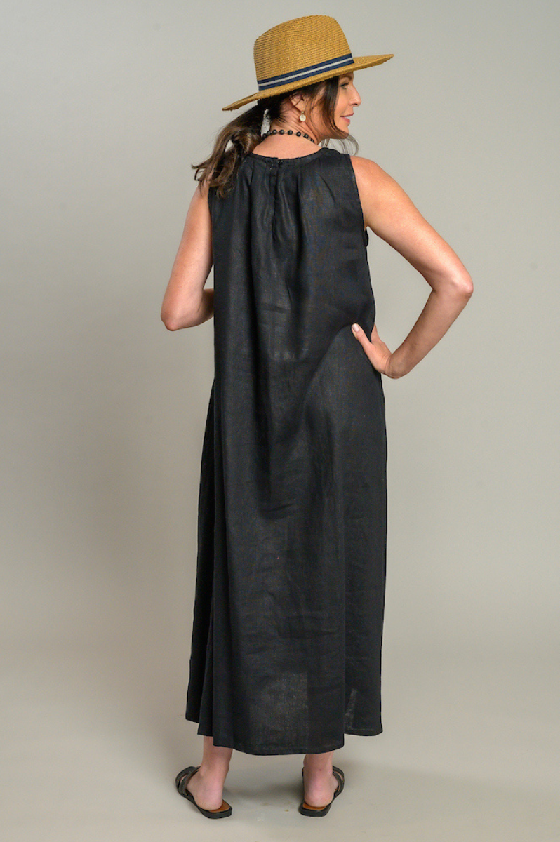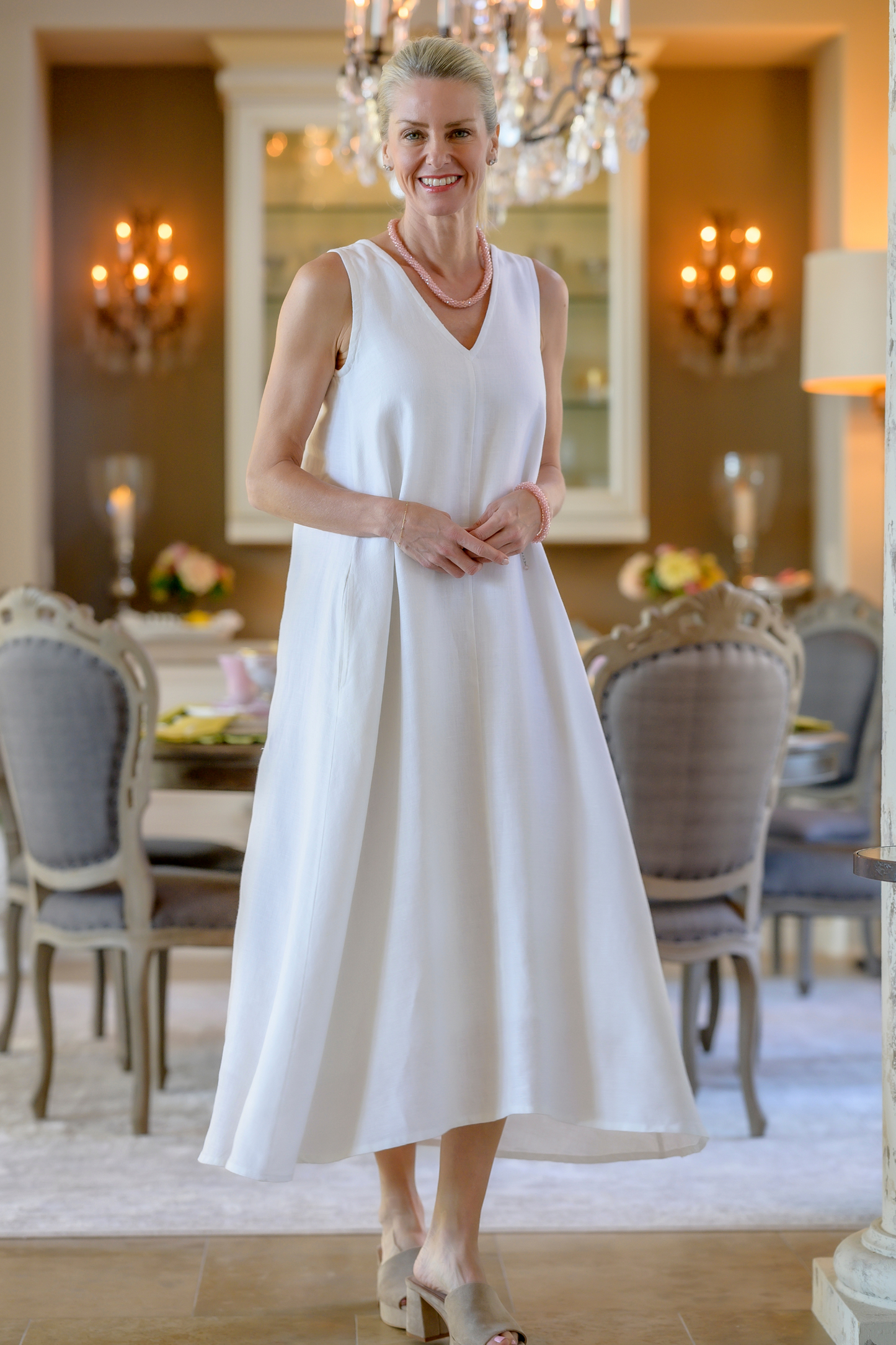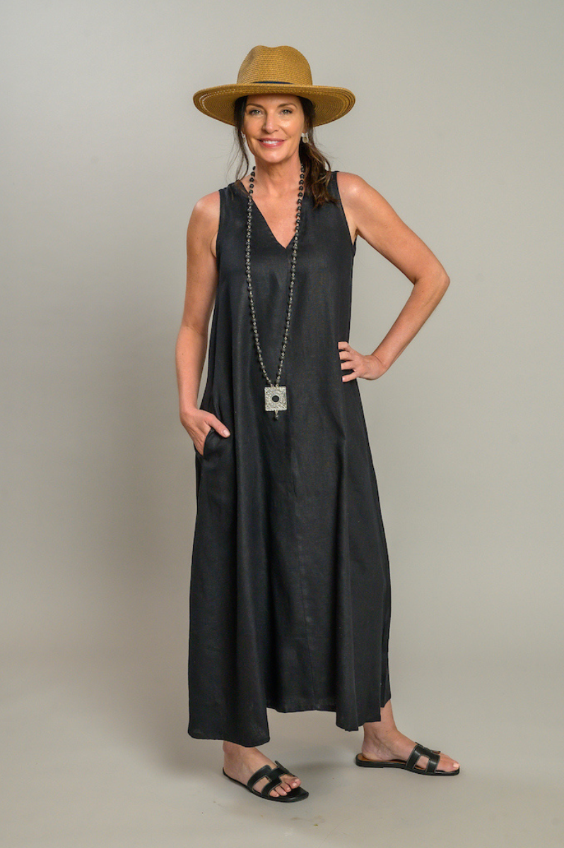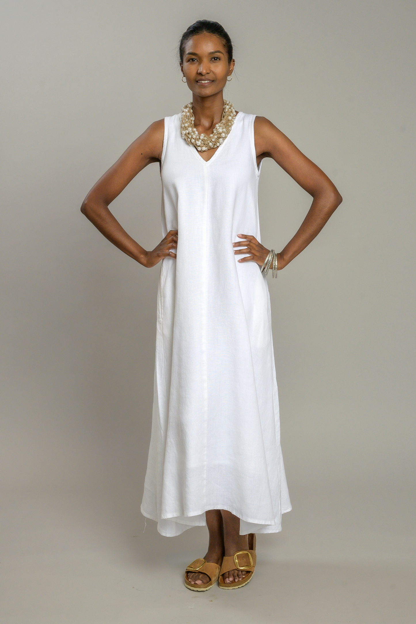 Our new summer weight linen dress. Light and easy and instantly makes you look elegant and carefree! V-neck with a 3/4 length A line design. Keyhole button enclosure on back. A great fit for many body types. Our Katherine dress comes in XXL!