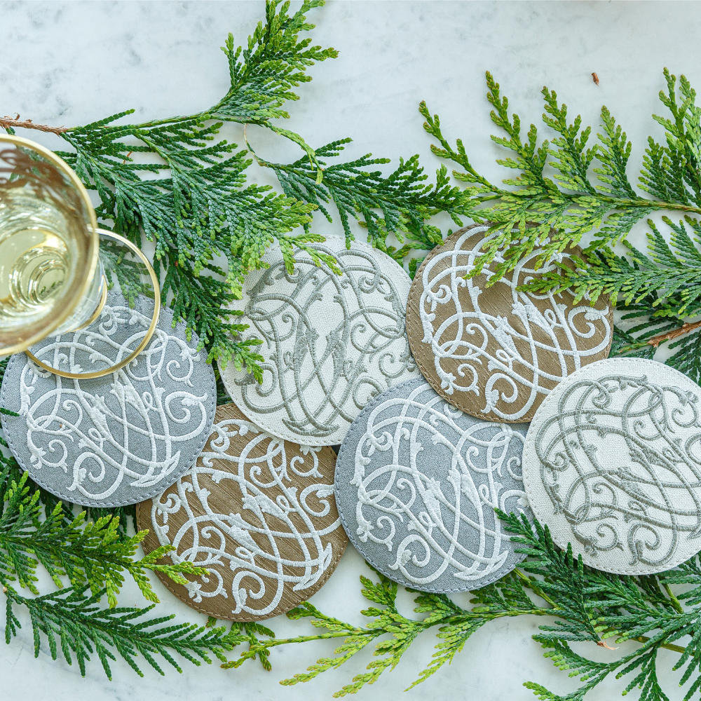 Protect your tables in style with our Palermo Baroque Coasters. Each coaster is thoughtfully designed for easy cleaning, ensuring effortless maintenance. Adorned with a captivating baroque embroidery pattern, these coasters bring an air of opulence and elegance to any occasion, making them a perfect combination of style and practicality.