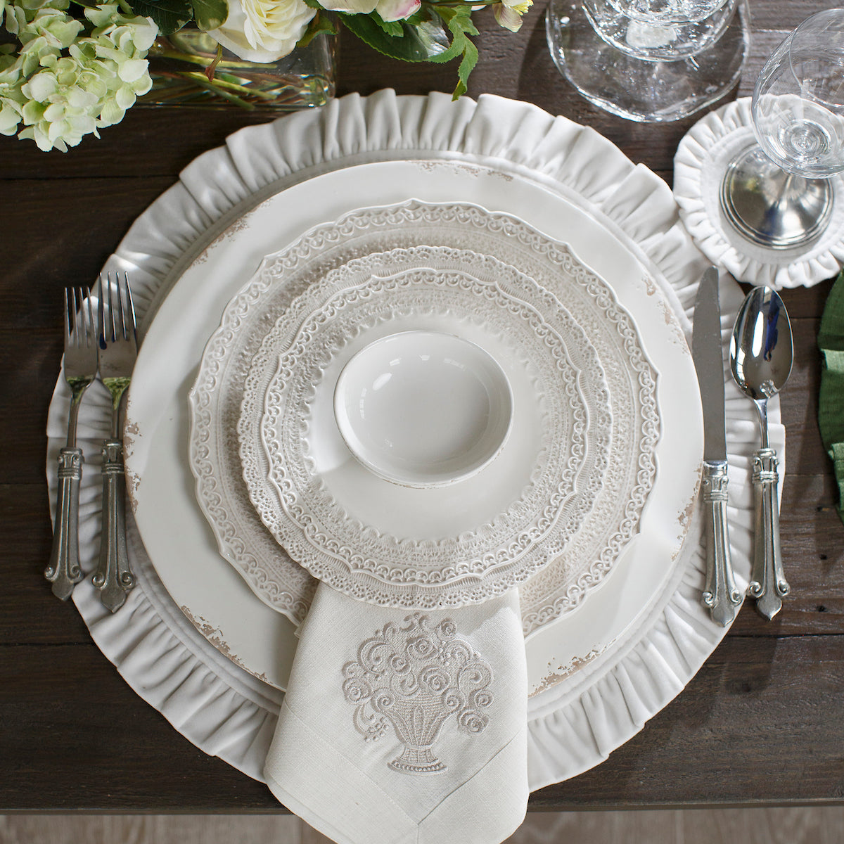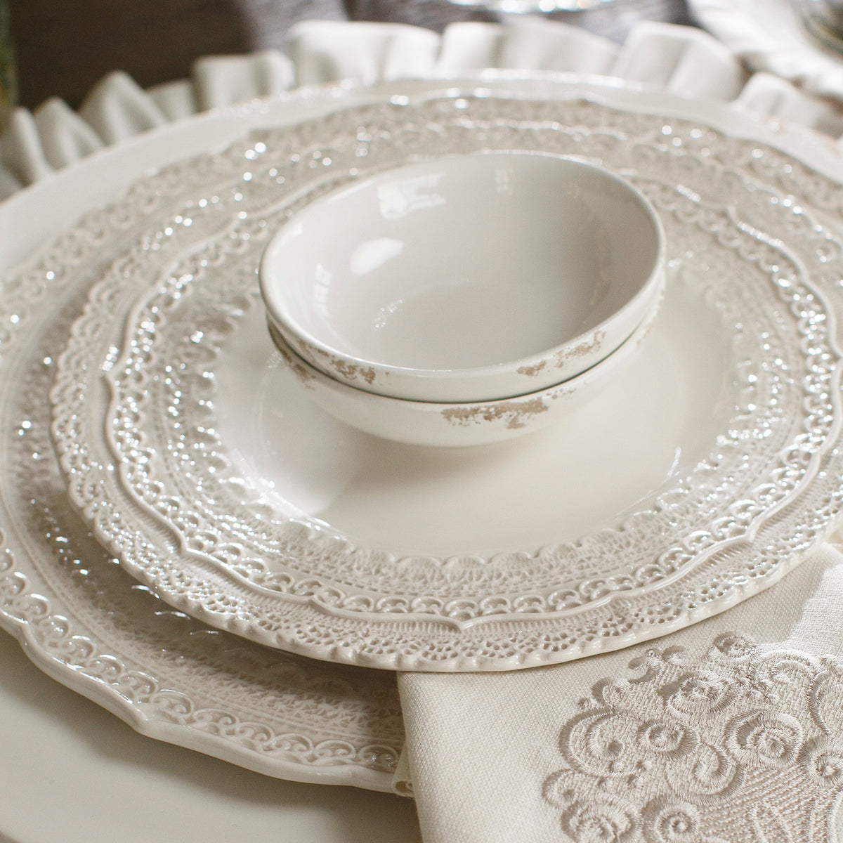Beautiful cream color with antique like aging add old world charm to any room or table with our Scavo collection. Italian ceramic. Hand made in Italy.