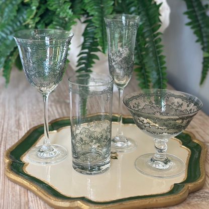 Our Giardino Glassware is both fun and refined. Their exquisite, finely etched colors create a vibrant yet elegant look. They pair beautifully with so many of our collections and linens. Don't they just make you happy?