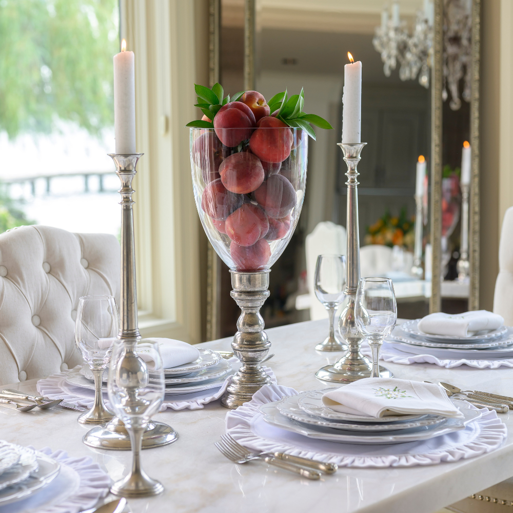 Our Giovanna Large Fluted Hurricane is a true heirloom piece. Majestic, exquisite and versatile. Perfect for outdoor candles or dramatic flower arrangements. They will be talking about your table for weeks! Between parties place them where you can enjoy them every day. They truly are art. Italian pewter, hand made in the Lombardy Region of Italy.