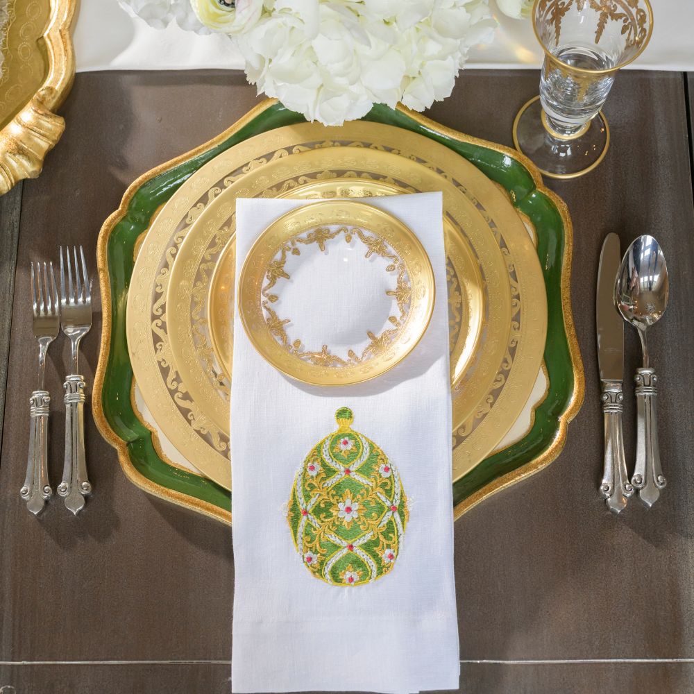 The Imperial Green Easter Egg Embroidered Linen Towel is a perfect fusion of regal history and natural luxury. Crafted from 100% premium linen, this towel features a stunningly detailed Imperial Egg design, intricately stitched in vibrant shades of sage green and gold. Its sophisticated colorway and delicate motif embody the essence of refined entertaining. A versatile accent for your table or a distinguished gift for those who appreciate the artistry of Italian-inspired design. Timeless elegance, thoughtfully crafted.