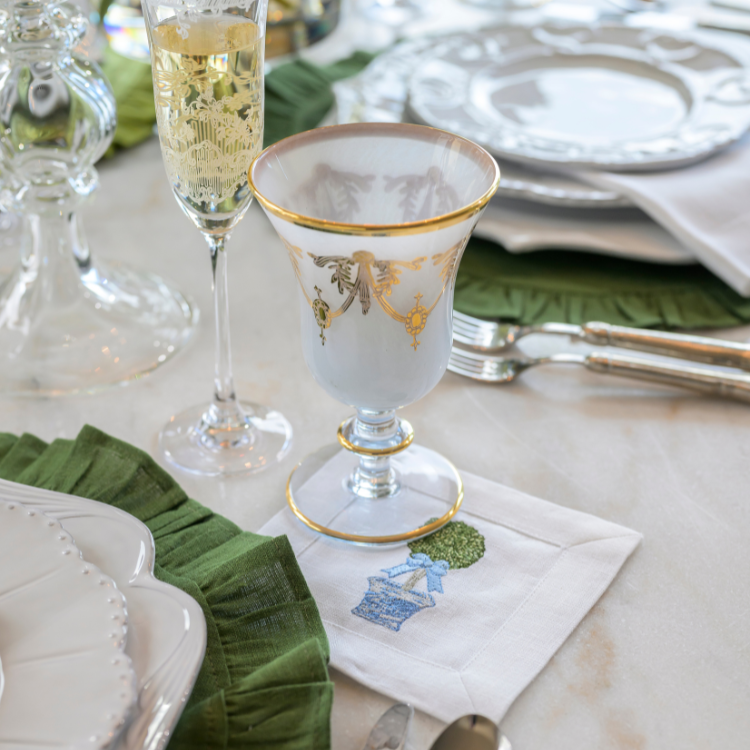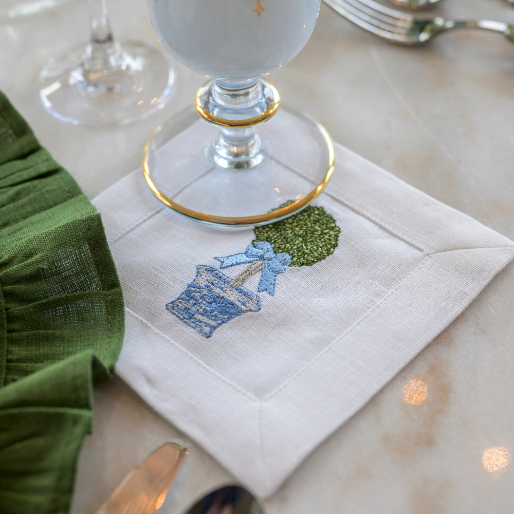 This beautiful set of four 100% European linen cocktail napkins will make your table look elegant and classy. Each cocktail size napkin is embroidered with a lovely "Chinoiserie Boxwood Topiary". Each set of four cocktail size napkins comes in a linen pouch for safe keeping, making it a great hostess gift.