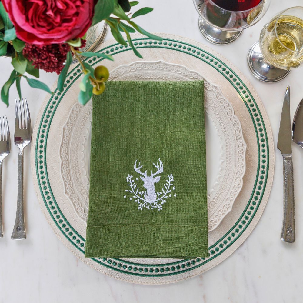 Our 100% European linen napkins are a perfect mix of elegance and beauty. This napkin is a lovely white linen with our Stag embroidery. Machine wash and lay flat to dry for a soft and comfortable look. Iron if desired for a more formal appeal.