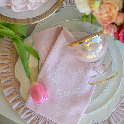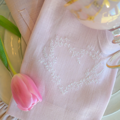 Vineyard Heart Linen Towel brings understated elegance to kitchen and bath spaces. Available in crisp white with a green heart or soft lilac pink with a white heart, each piece combines premium linen construction with charming artisanal detailing. Perfect for everyday use or as a thoughtful gift, these towels add a refined touch of personality to your home.
