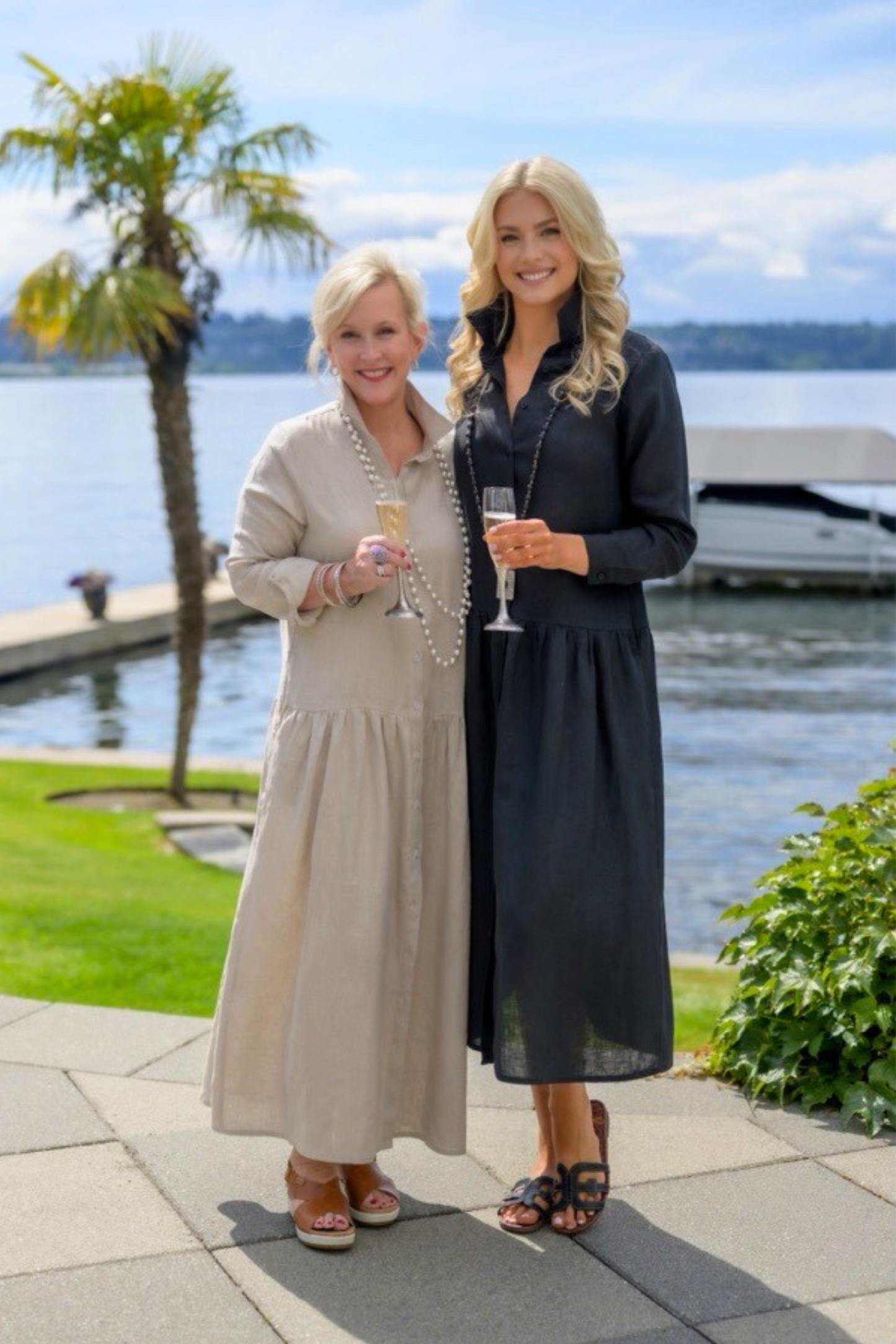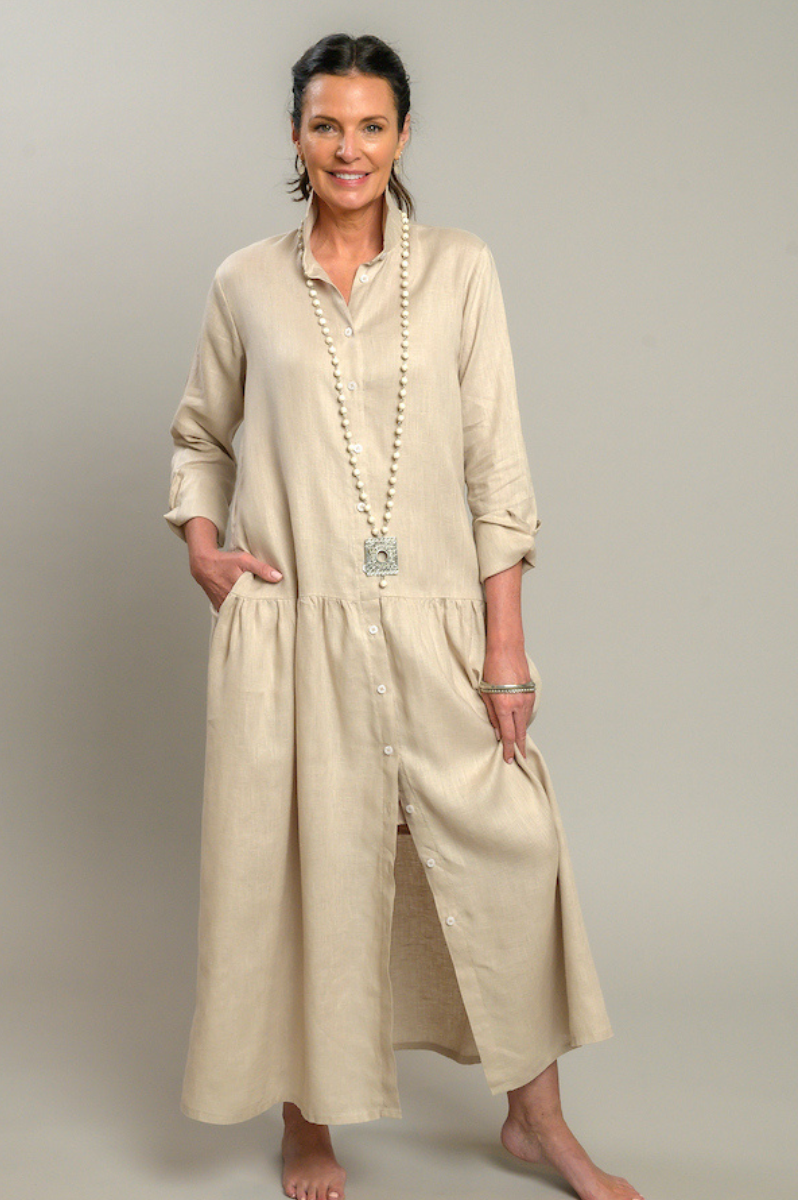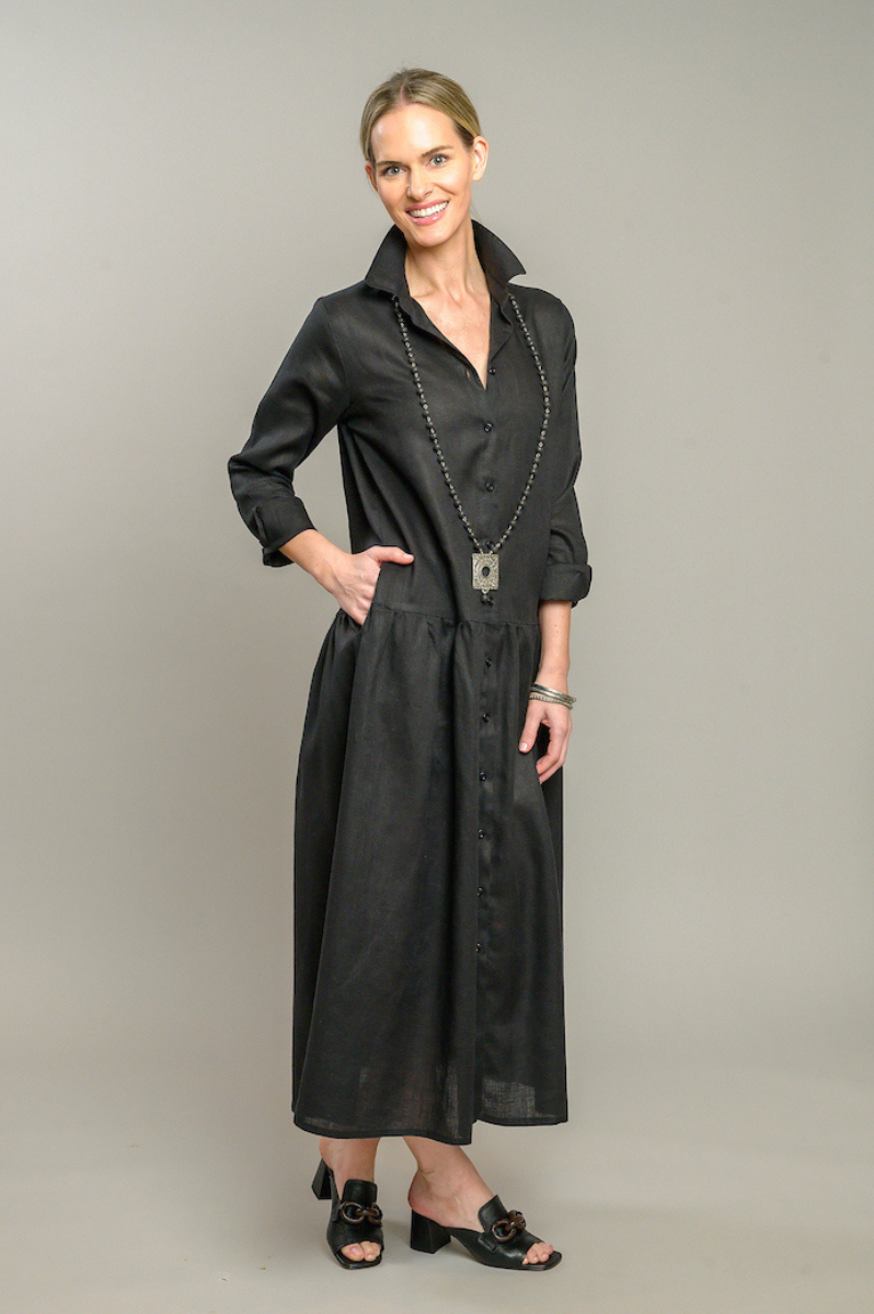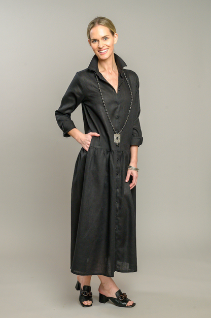 Add this standout dress to your wardrobe! The button-up front and long sleeves add a touch of refinement and sophistication. Perfect for any occasion with a gracefully flowing silhouette and a collar neckline, this dress exudes effortless luxury.