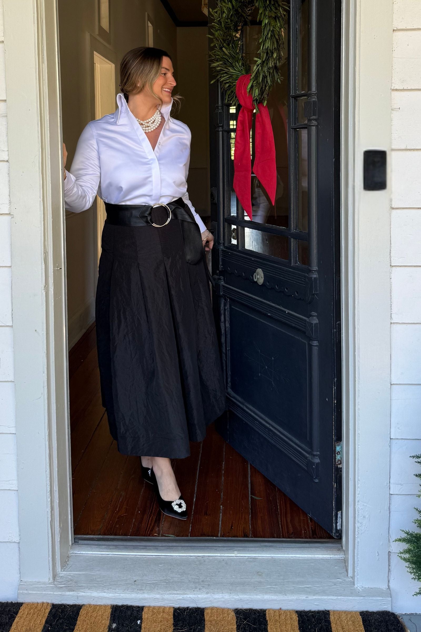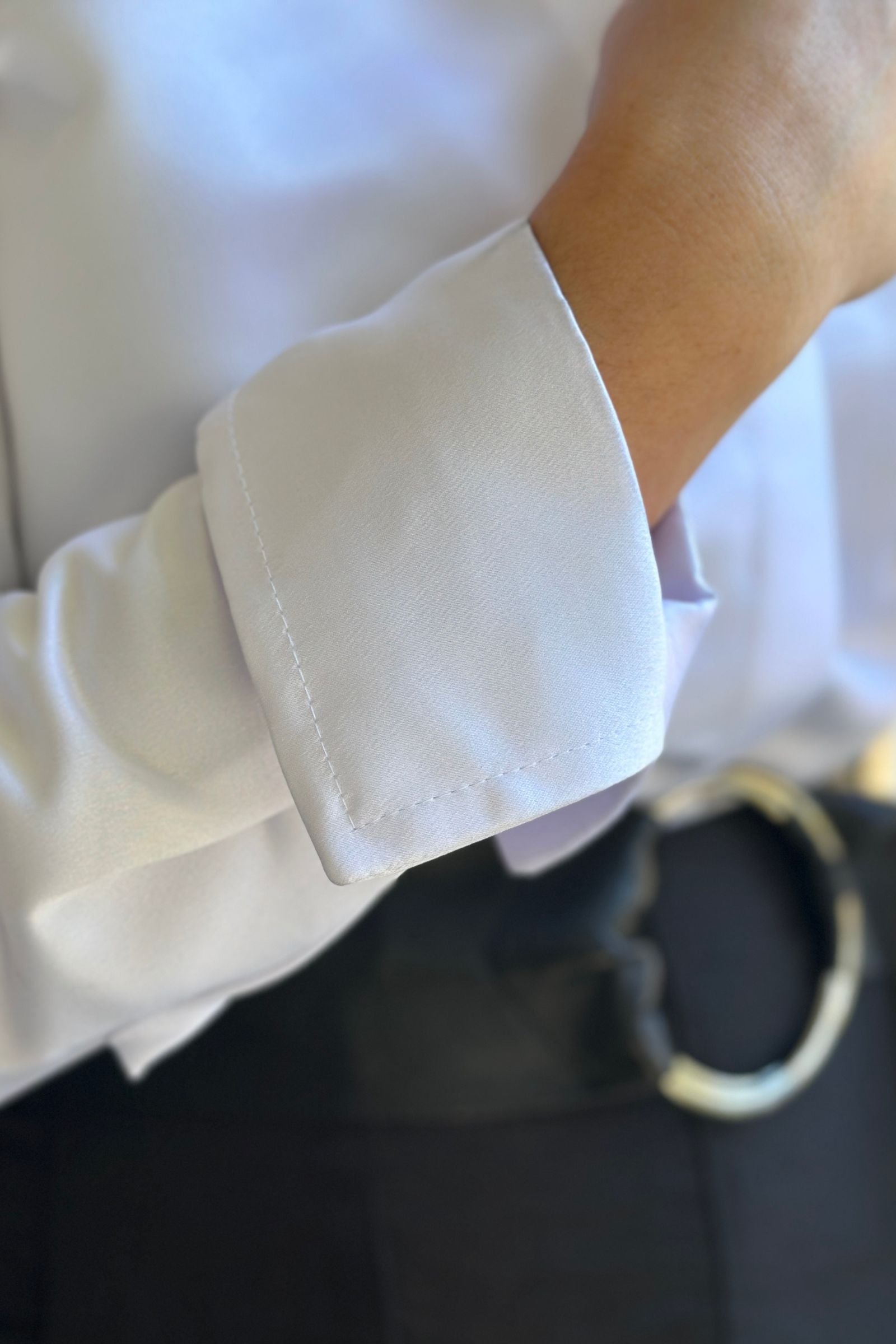 The Candace Taffeta Blouse features a striking large collar and elegant button-up front, creating a refined silhouette. With delicate cuff detailing, this blouse blends classic sophistication with modern design, perfect for elevating your wardrobe with effortless style. Crafted from a thicker taffeta weave, the snow white fabric allows for opaque coverage.
