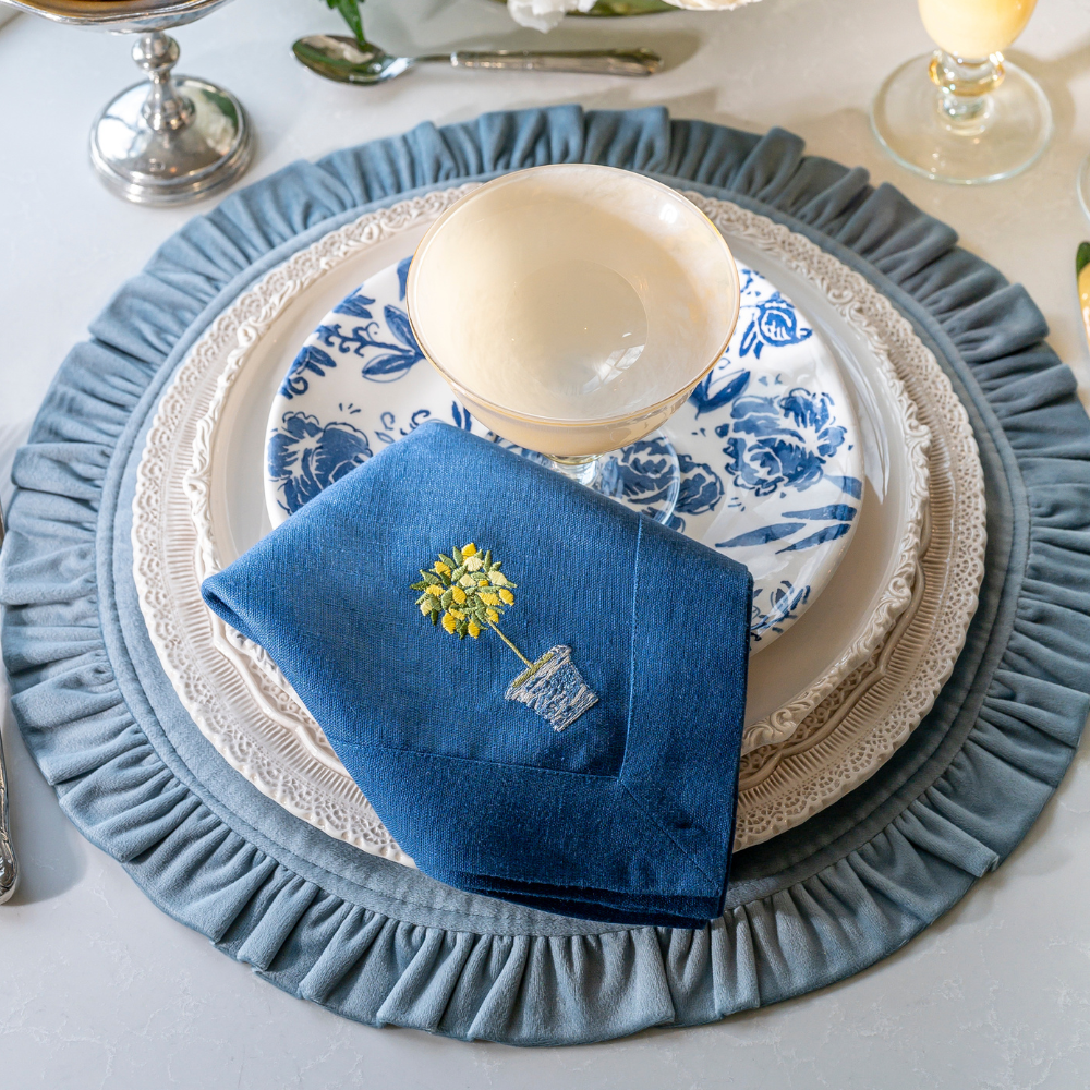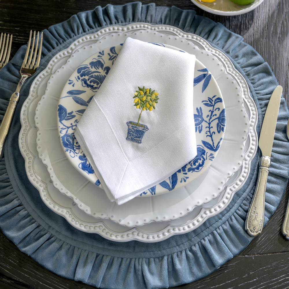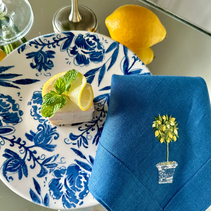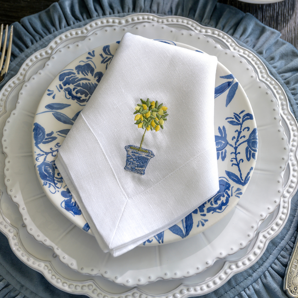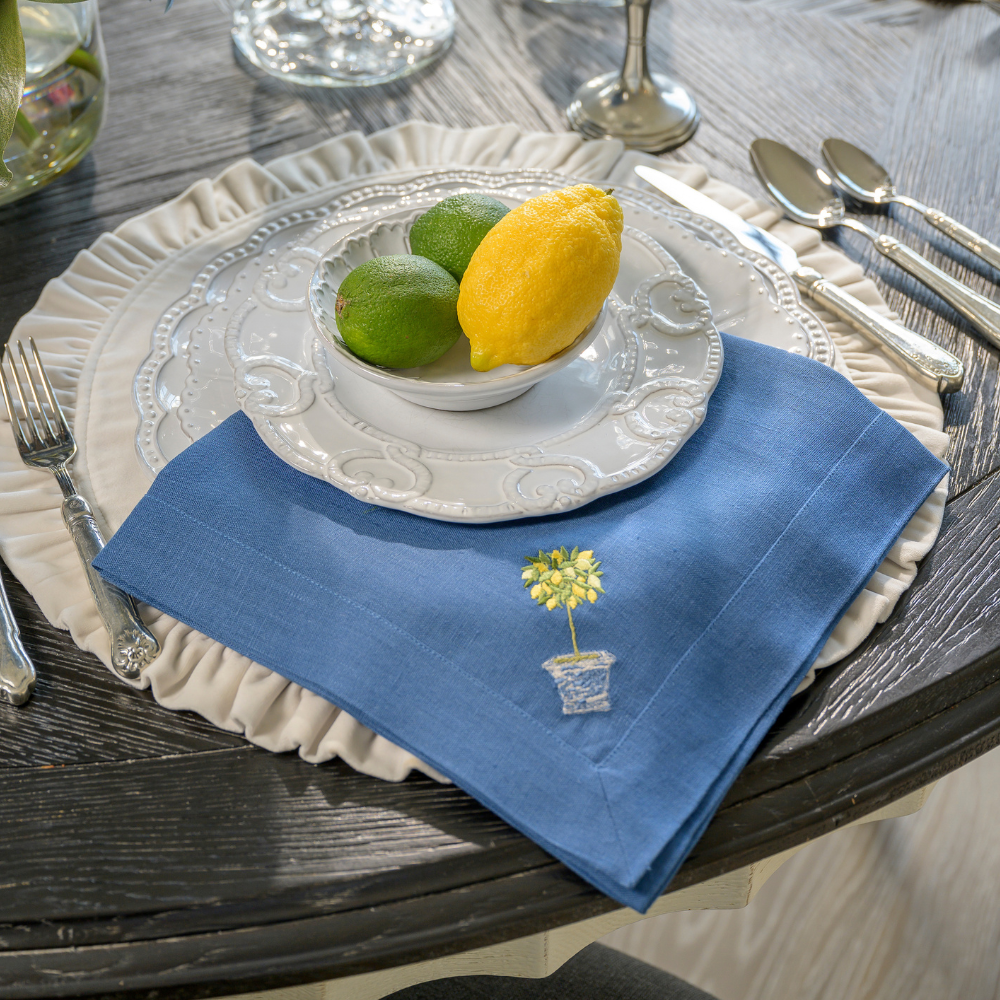 Add some zest to your dining experience with our Lemon Topiary Large Napkin! Made in Ukraine, this linen napkin features a charming embroidered lemon topiary in a chinoiserie pot. Inspired by Italian design, it's the perfect playful touch for any meal.