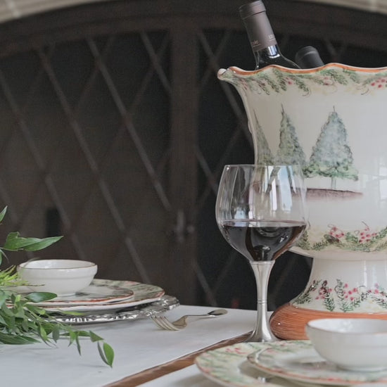 Buon Natale! Our best-selling Natale Collection is one of the most popular lines in the industry. Festive, yet soft, it features majestic snowy evergreens surrounded by enchanting pine boughs and winterberries. All hand painted, no two pieces are alike. Customers love its "wintery" look, perfect for Christmas celebrations but so beautiful throughout the winter season.