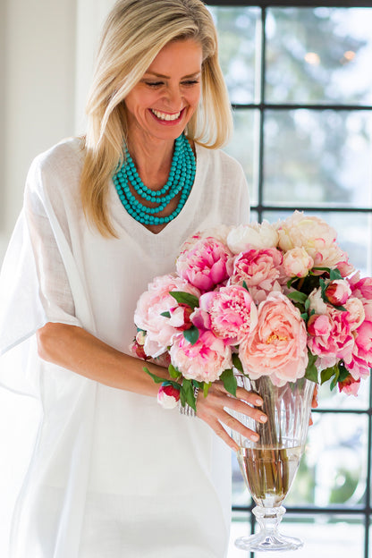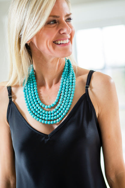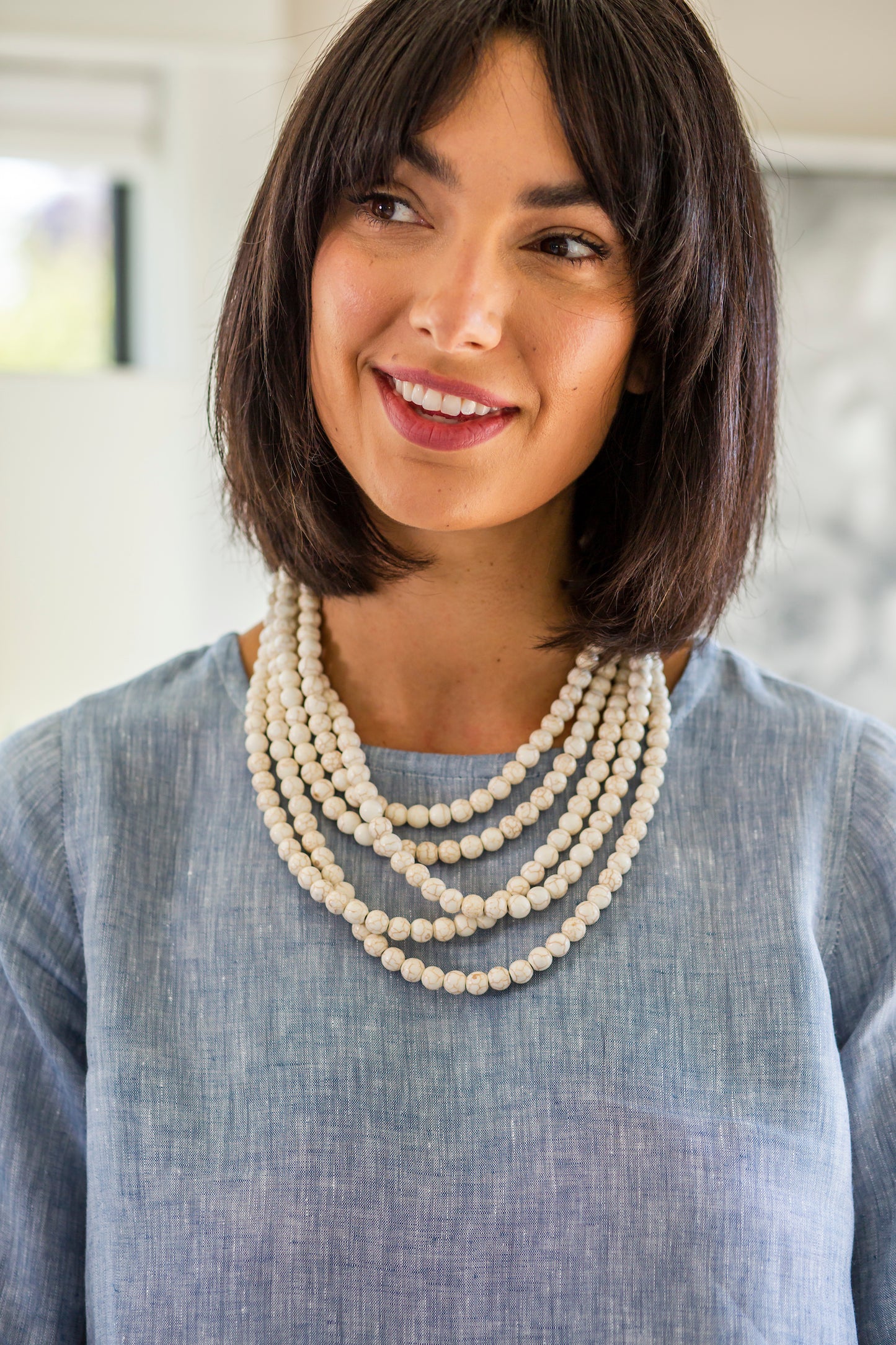 Meet your new favorite statement necklace! Five strands of polished cream stone beads connected on both sides to create an elegant look that drapes beautifully on the neck.