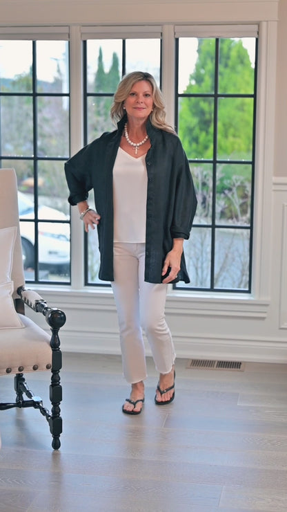 Introducing the Scotty Boyfriend Button Up Top - Made with 100% linen, this top has a generous fit through the body and arms. Made of a lightweight summer weight linen it is the perfect top to throw on with a pair of linen pants, jeans or as a cover up over a bathing suit or tank top.