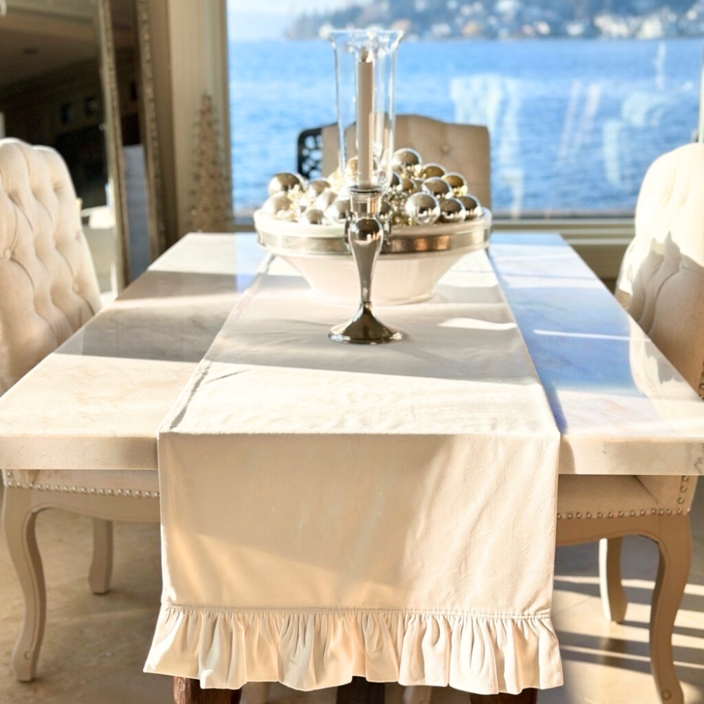 Enhance your dining experience with our luxurious Velvet Table Runner. Offered in a variety of vibrant colors and available in both 90" and 108" lengths to fit any table size. The elegantly designed ruffle detail adds a touch of timeless sophistication, while the easy-care fabric ensures effortless clean-up. Enjoy your meal in style!