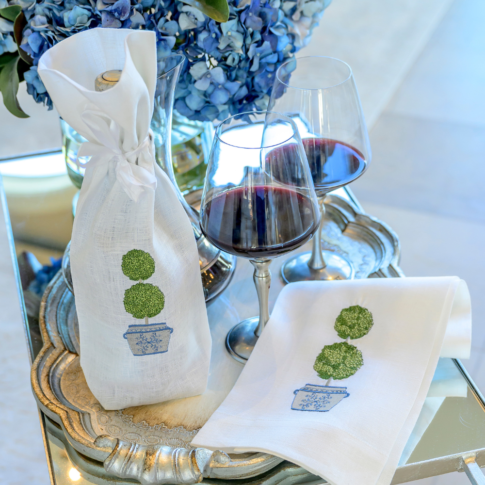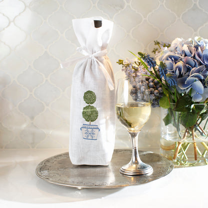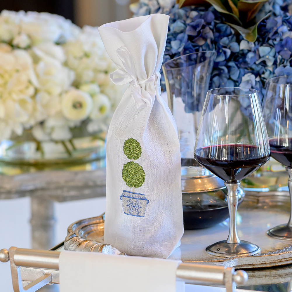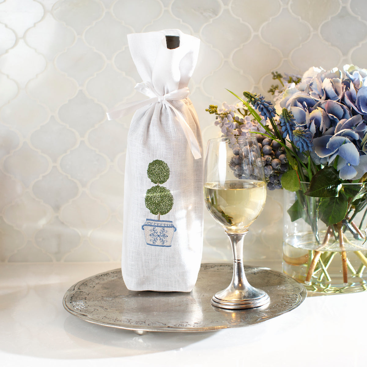 This 100% European linen wine bag embroidered with our "Double Topiary" design will make any bottle of wine a memorable gift. The bright green and blue pattern is sure to brighten anyone's day!