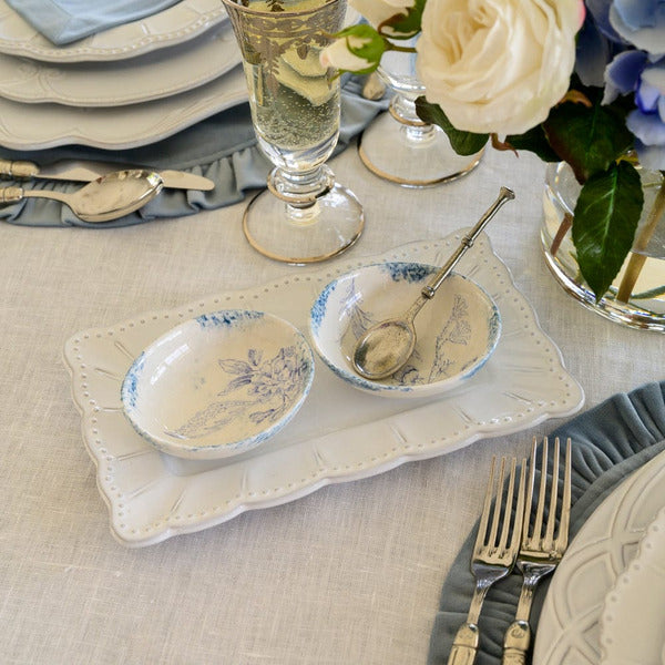Our Giulietta Collection, light, beautiful and romantic is the result of truly extraordinary artistry. The design is applied to the ceramic by hand, fired and then hand painted with a sponge before being fired a second time. Little wonder it is so fair! Offered in both blue and gray. Hand made in Tuscany.