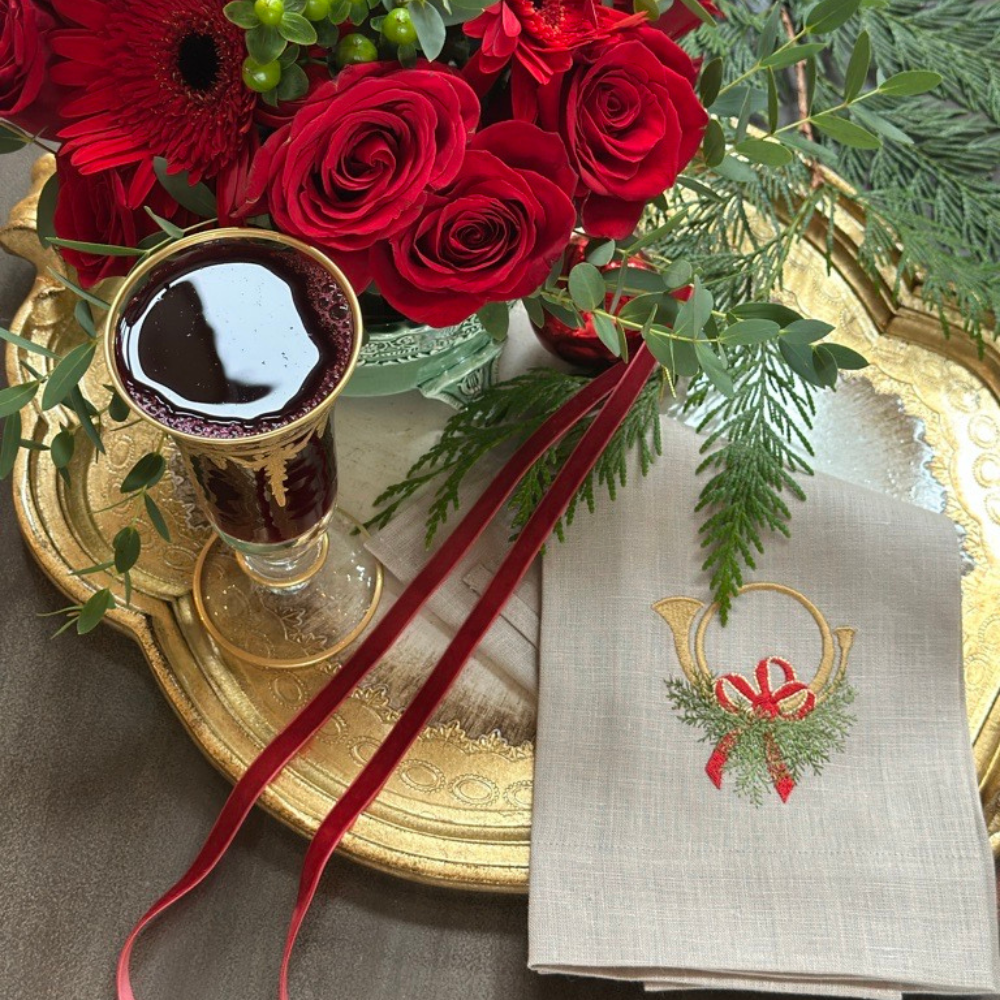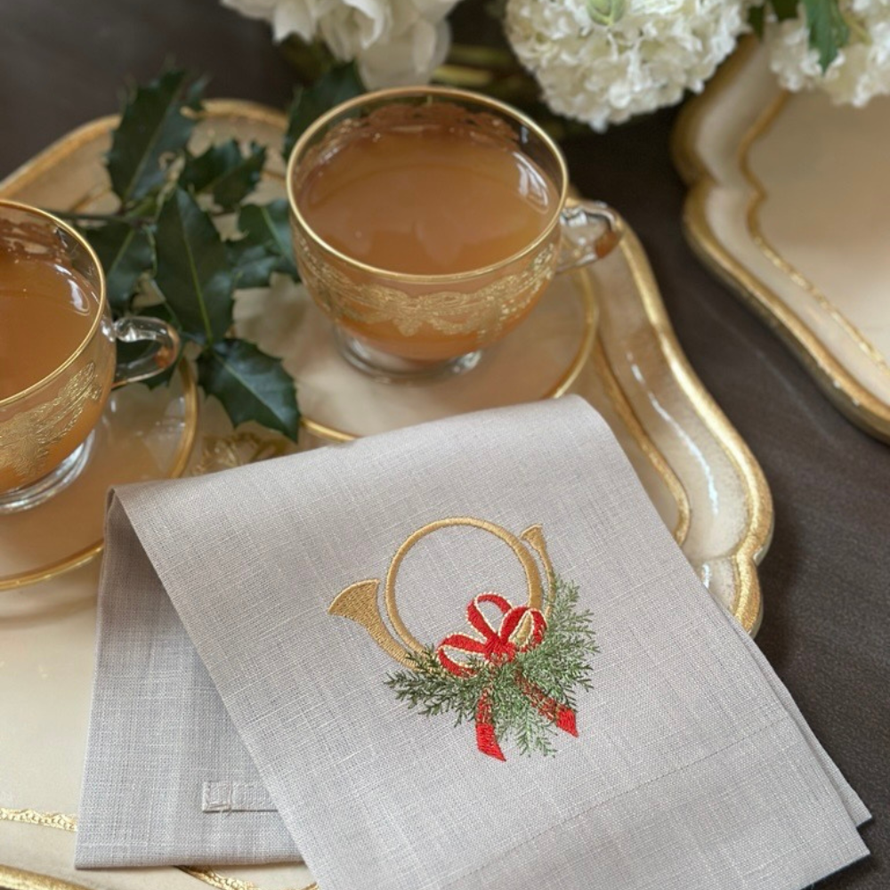 Celebrate the season with the Holiday Horn with Bow Towel, crafted from luxurious 100% linen. Featuring a playful vintage horn adorned with a red bow and pine sprigs, this towel brings festive cheer and classic elegance to your kitchen. Ideal for adding a stylish and joyful accent to your seasonal decor.