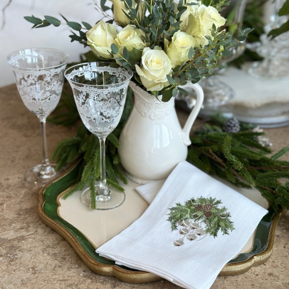 Spruce up your kitchen for the holidays with the Jingle Bell Swag Towel. Crafted from 100% linen, it showcases a delightful pine swag accented with shimmering silver jingle bells, adding a joyful sparkle to your festive decor. Ideal for holiday decorating or as a cheerful gift!