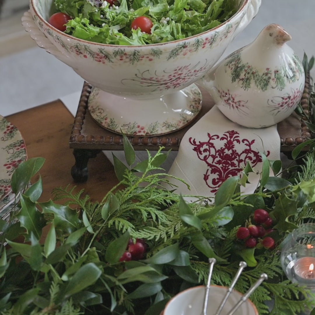 Buon Natale! Our best-selling Natale Collection is one of the most popular lines in the industry. Festive, yet soft, it features majestic snowy evergreens surrounded by enchanting pine boughs and winterberries. All hand painted, no two pieces are alike. Customers love its "wintery" look, perfect for Christmas celebrations but so beautiful throughout the winter season.