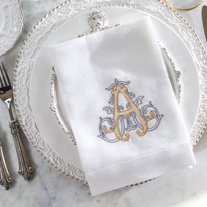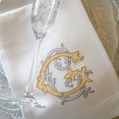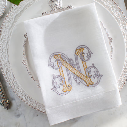 Our 100% European linen tri-fold napkin set is a perfect mix of elegance and beauty. Each napkin is embroidered with a detailed Vintage Vine monogram embroidery in the center with 21 different letters available. Machine wash and lay flat to dry for a soft and comfortable look. Iron if desired for a more formal look.