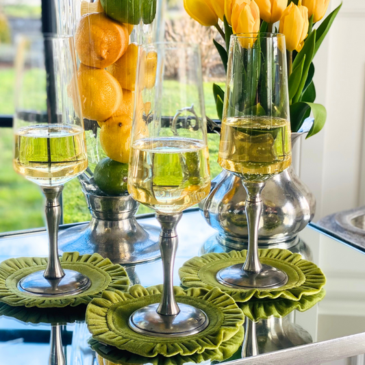 Our New Siena Glassware features a contemporary glass contour with a timeless, heirloom quality curved pewter stem creating a unique, eye-catching look. Offered in three styles, White Wine, Red Wine and Champagne Flute.