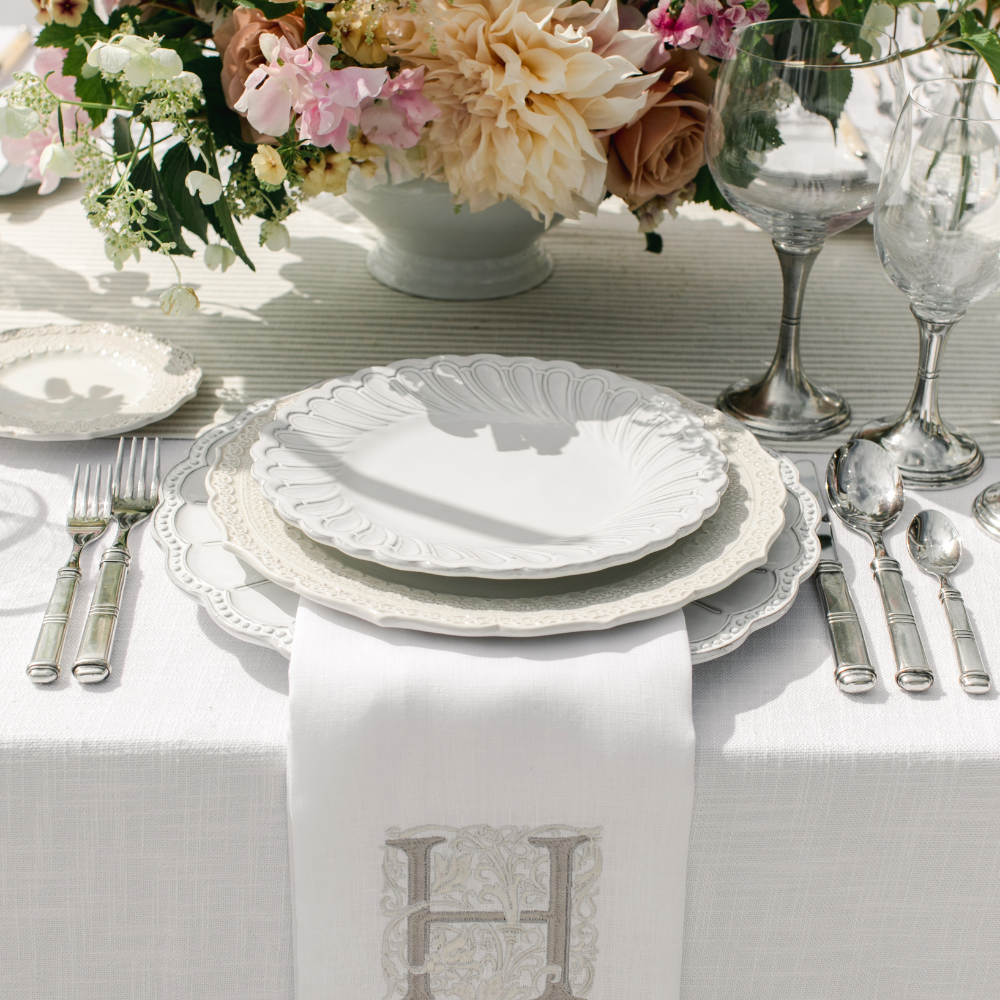 Our Bella Bianca Pique Salad/Dessert Plate creates a unique and striking contrast with the Rosette and Beaded Dinner plates.