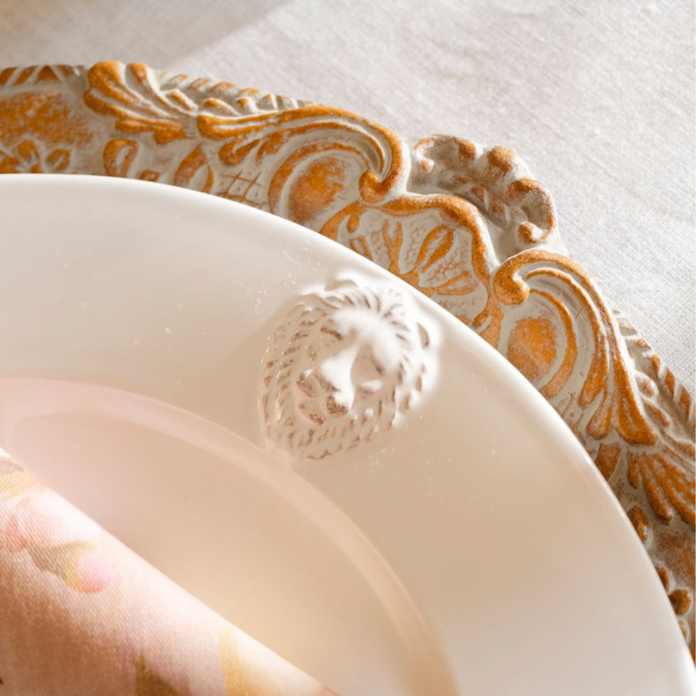 Our Florentino Baroque Collection is comprised of extraordinary hand made wood pieces. Crafted from warm wood with authentic Italian artistry, this ornate beauty features intricate carved detailing and serves as a beautiful foundation for table settings complementing our tableware collections. Perfect for building sophisticated place settings, it transforms any dinner into a gallery-worthy moment. Whether you're layering it beneath dinnerware or showcasing it solo, this charger adds polish that turns an ordinary table into an experience.