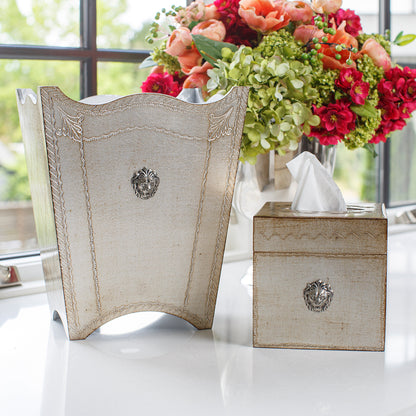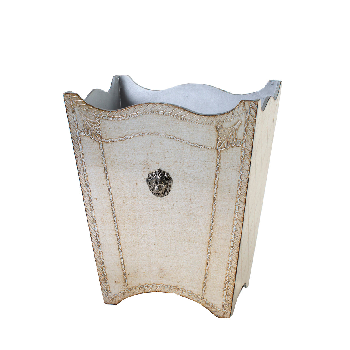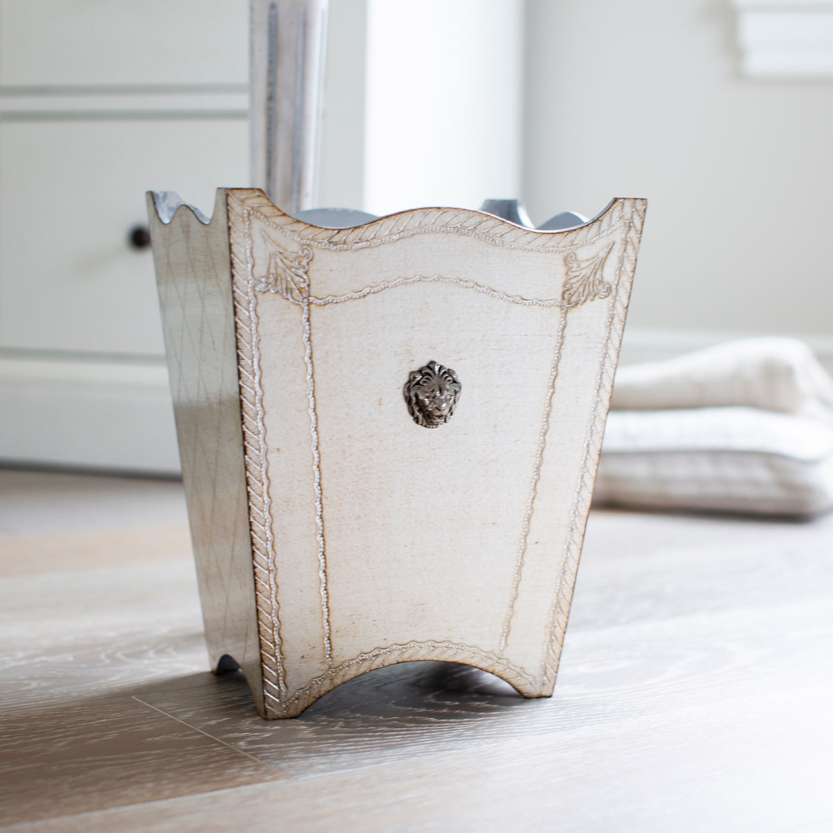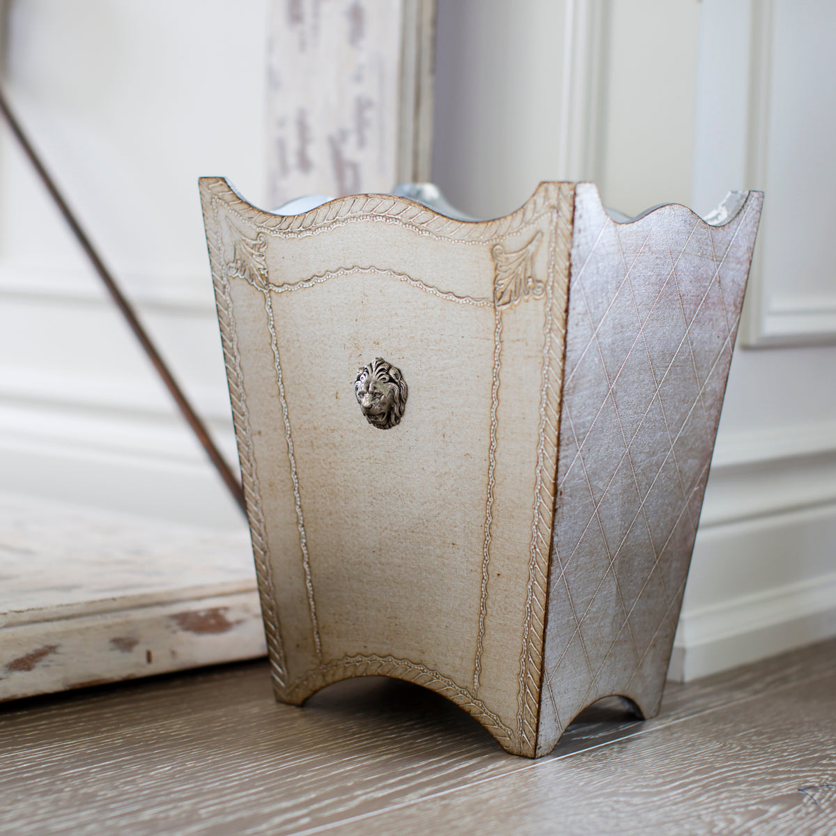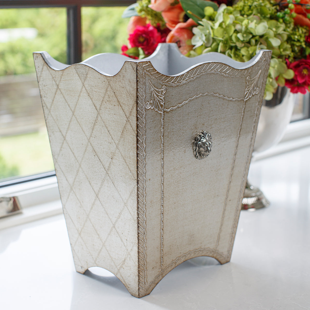 Our classic Florentino Leone Wooden Waste Basket Antique Silver is finished with an exquisite antique gold and silver design and is adorned with the iconic Florentino lion head in pewter. You won't find anything like it anywhere. Pair with our Florentino Tissue  Box Cover to add that perfect detail to any room.