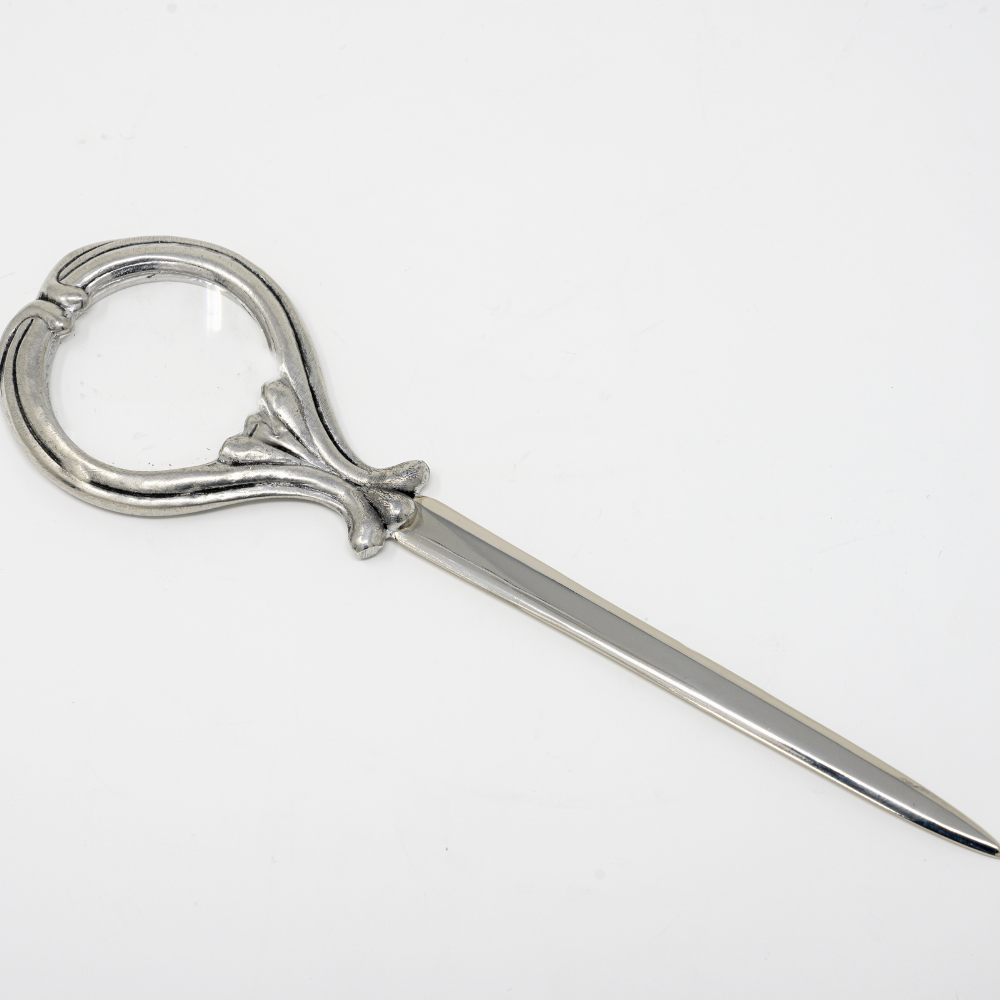 Elevate your office with our Letter Opener with Magnifying Glass. The stylish pewter and stainless steel design effortlessly combines form and function. Ideal for a closer look, this accessory is a must-have for any discerning professional. Enhance your work experience, and treat your fingertips and eyes to a touch of luxury.