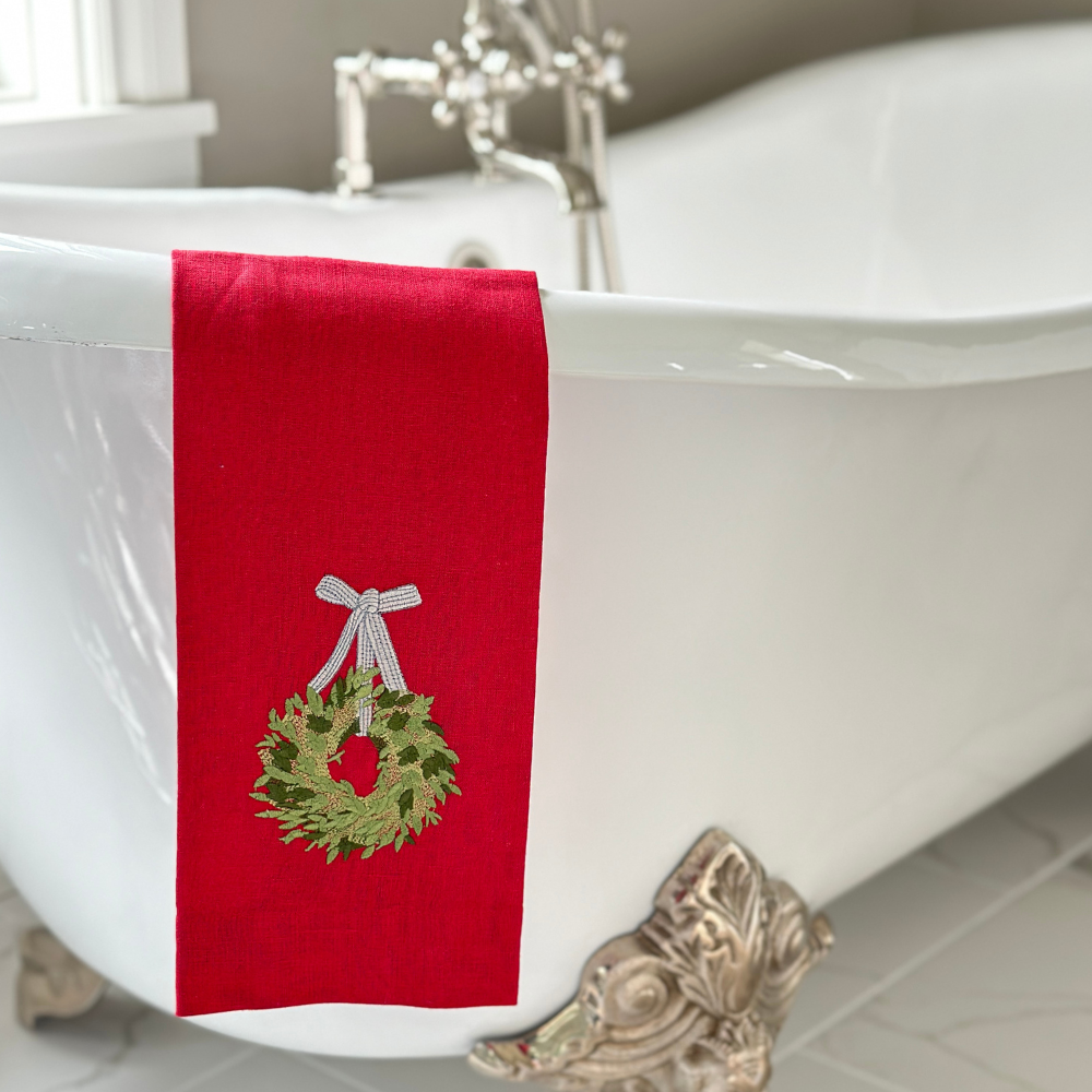 Bring seasonal warmth to any room with this delightful linen towel, adorned with a charming boxwood wreath and graceful bow. Crafted from 100% pure linen, it doubles as both a practical kitchen or bath essential and a festive decorative accent. Perfect for holiday displays or year-round enjoyment.