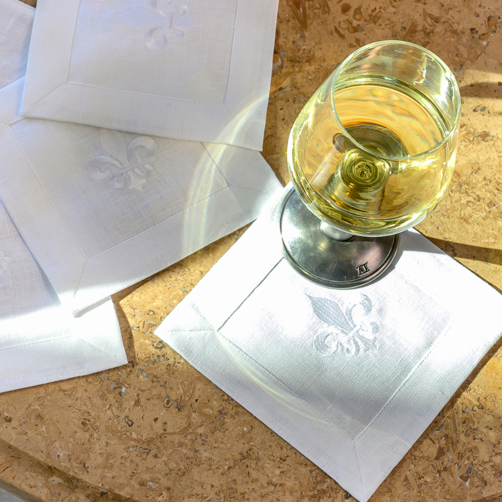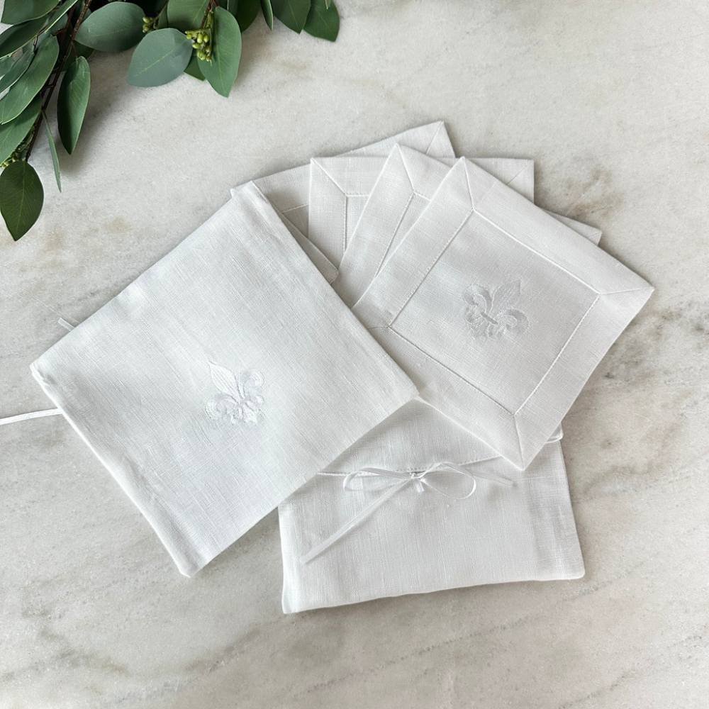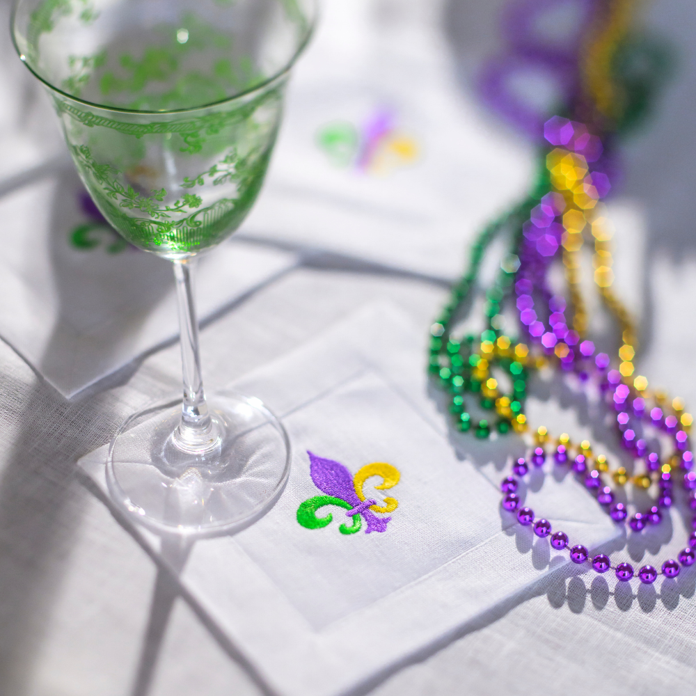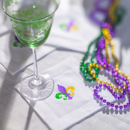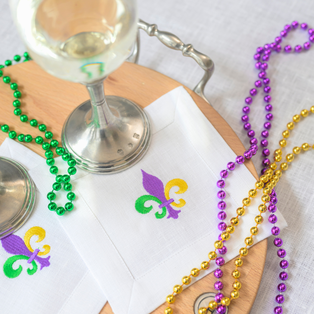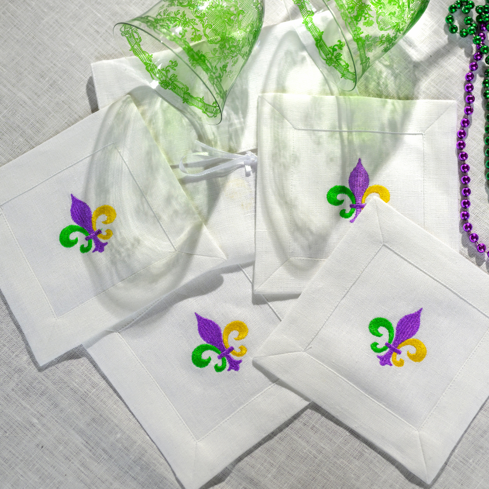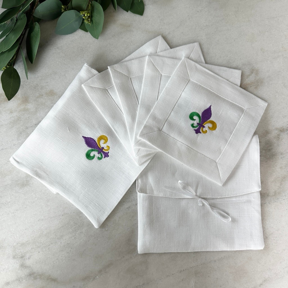 Add a touch of whimsy to your Marti Gras celebration! This beautiful set of four 100% linen cocktail napkins will make your table look fun and festive. Each cocktail size napkin is embroidered with a lovely Fleur de lis. Our set of four cocktail size napkins comes in a linen pouch for safe keeping, making it a great hostess gift.