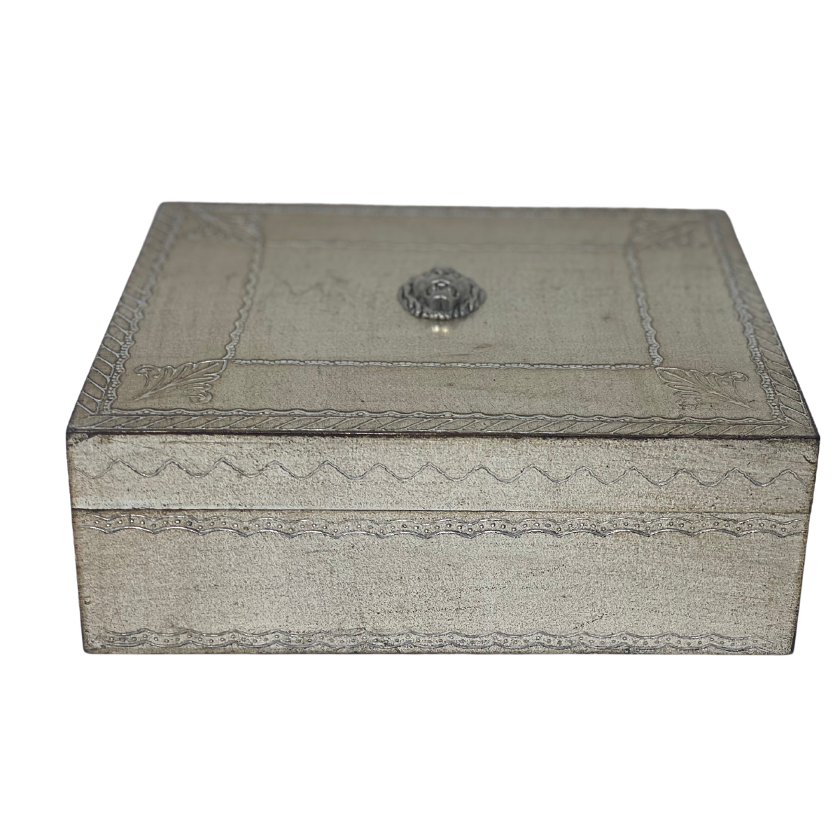 Our classic Florentino Wooden Box is finished with an exquisite antique gold and silver design and appointed with an iconic lion head in pewter. Discover a one-of-a-kind treasure like no other. An exquisite and timeless wooden box, perfect for storing jewelry or precious keepsakes.
