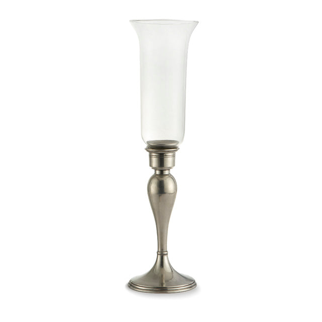 Light up your space with the Giovanna Tapered Hurricane. This classic piece features an elegant Italian pewter base and a glass hurricane. Perfect for a tapered candle. Bring sophistication to any room with this luxurious addition. Also great for al fresco dining as the candle will stay lit even with a slight breeze due to the protective glass hurricane.