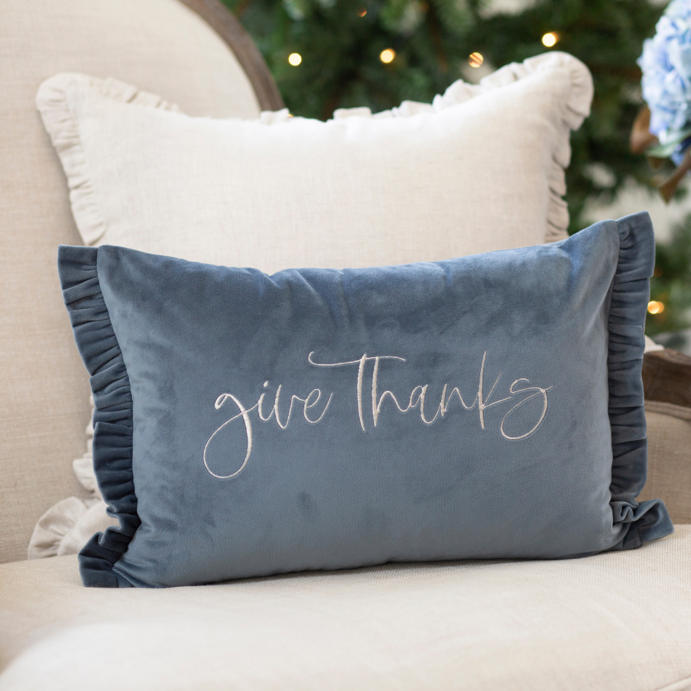 Add a touch of elegance and style to your home with a 100% European velvet decor pillow embroidered with our timeless "Give Thanks" design. Pillow comes 13" x 19", has a zippered opening and filled with hypoallergenic synthetic down fill. Pillow comes with a ruffle or framed edge. Machine wash, lay flat to dry for best look.
