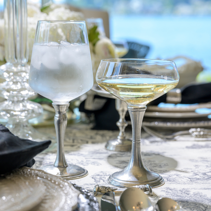 Shakespeare may not have been referring to our Verona Collection but so many of our customers share his sentiment. Graceful forms of glittering glass stand atop handcrafted pewter stems. True vintage heirloom pieces that will carry memories across generations. Italian pewter and glass; hand made near Verona in the Lombardy Region of Italy.