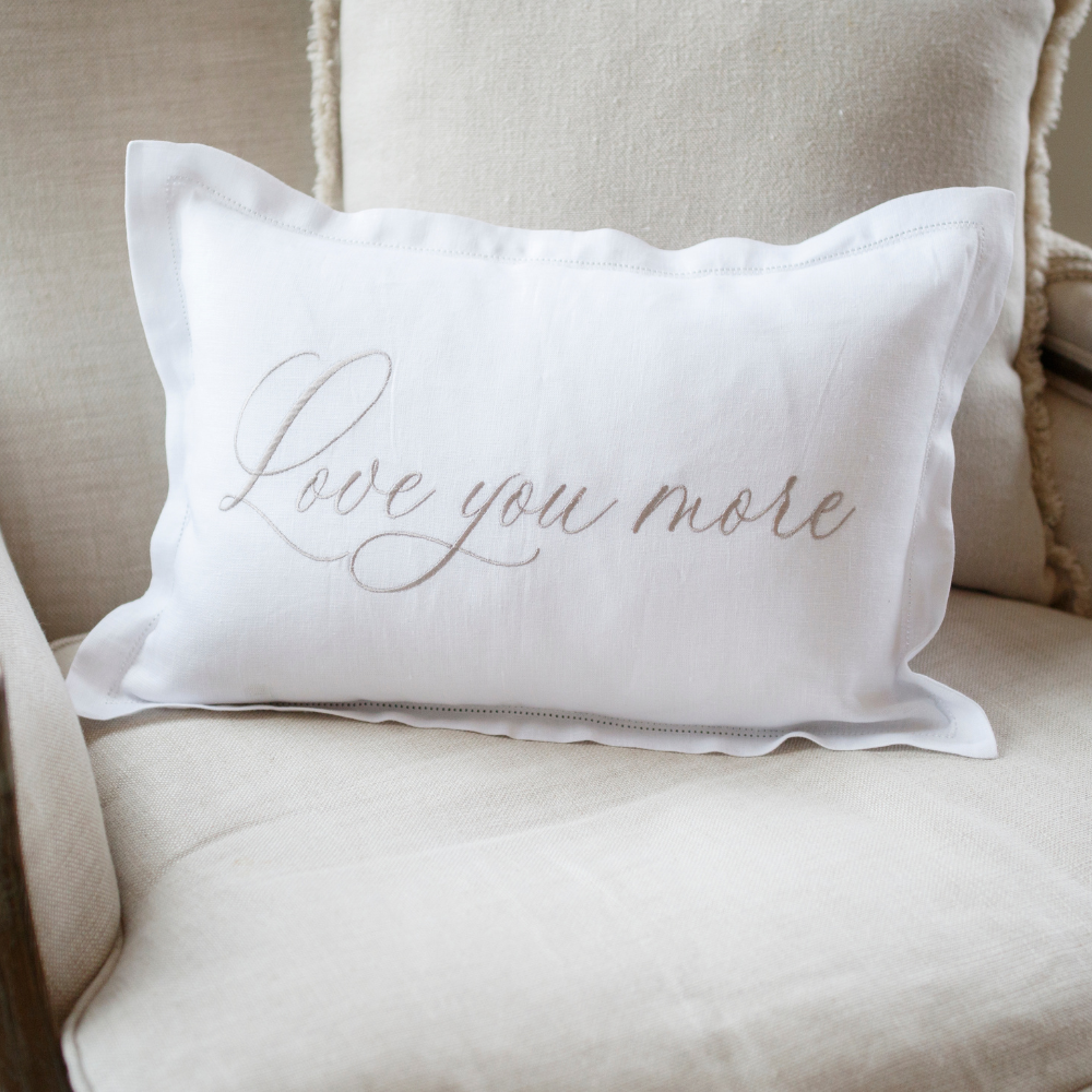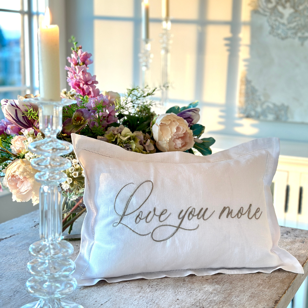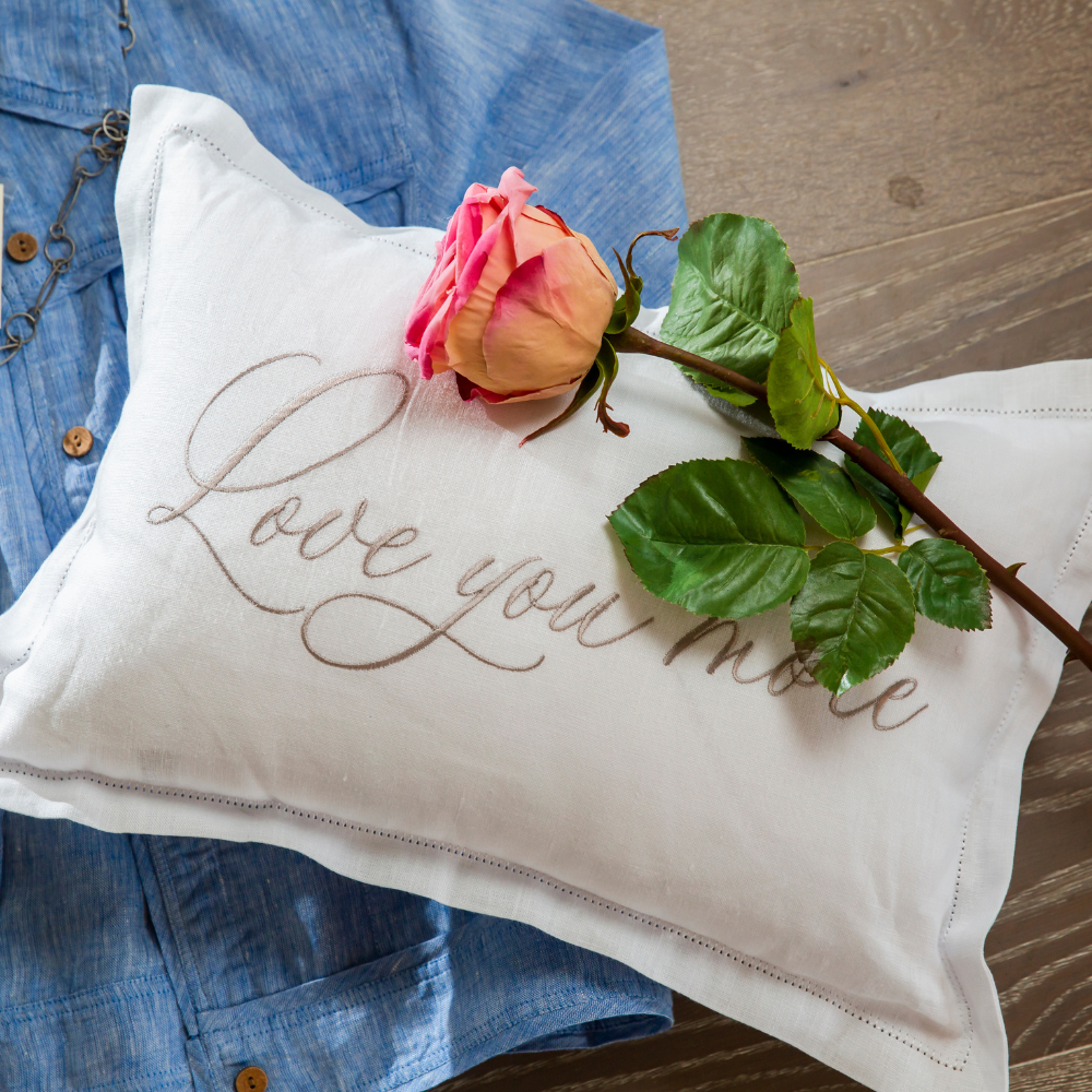 Add elegance and style to your home with a 100% European Linen décor pillow embroidered with "Love You More". This Pillow has our decorative hemstitch border. Pillow is 13" x 19", has a zippered opening and is filled with a hypoallergenic synthetic down fill. Machine wash, lay flat to dry and easy iron for best look.