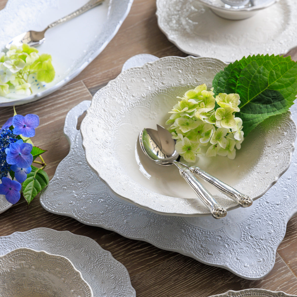 Inspired by the world-famous merletto (lace) from the Venetian island of Burano, this collection with its delicate, low relief design is finished entirely by hand. The various textures of lace create a delicate, refined and romantic look. We can't all live in Venice but Venice can live in us. Made from black clay, it is extremely durable and easy care. Offered in both White and Antique that pair beautifully with one another.