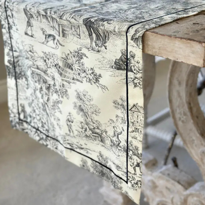 Italian cotton table runner with a charming black and cream Italian toile design. All sides have an inlaid black piping detail.