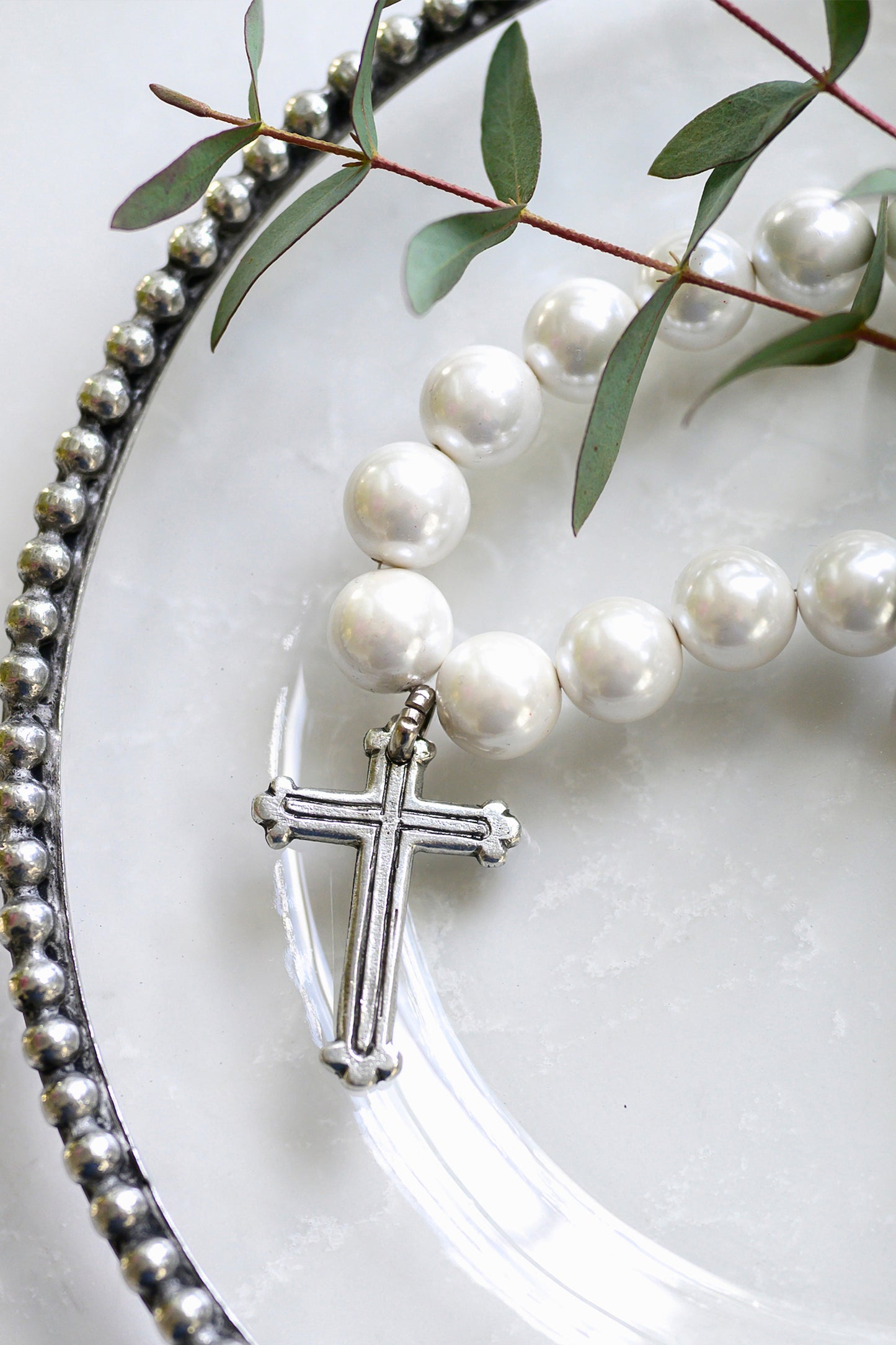 This stylish faux pearl necklace is classic and stunning! The pewter cross adds the perfect touch of understated elegance, creating the perfect accessory for formal dress or casual style.