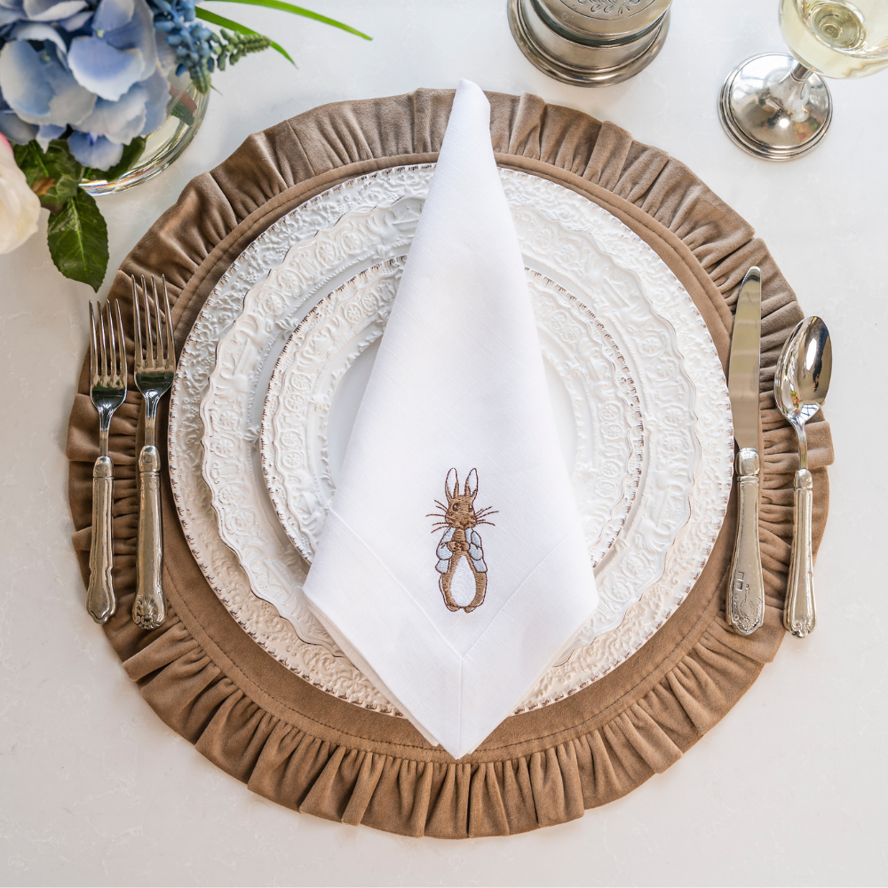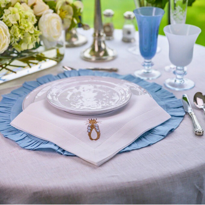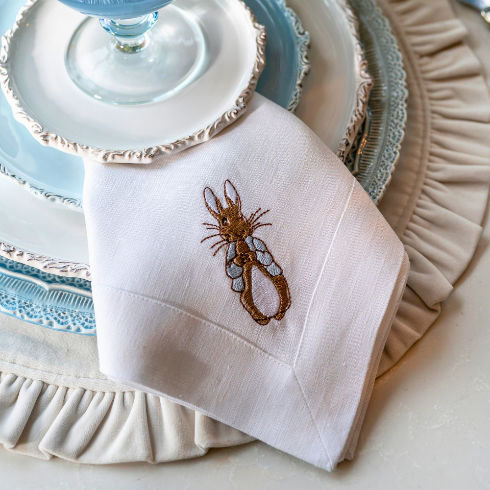 Add timeless elegance to your Easter table with this beautiful 100% European linen napkin with our "Peter Rabbit" embroidery. Embroidery colors are designed to complement our favorite tabletop collections. This napkin adds beauty to any part of your home. Machine wash, lay flat to dry and iron for a crisp look.