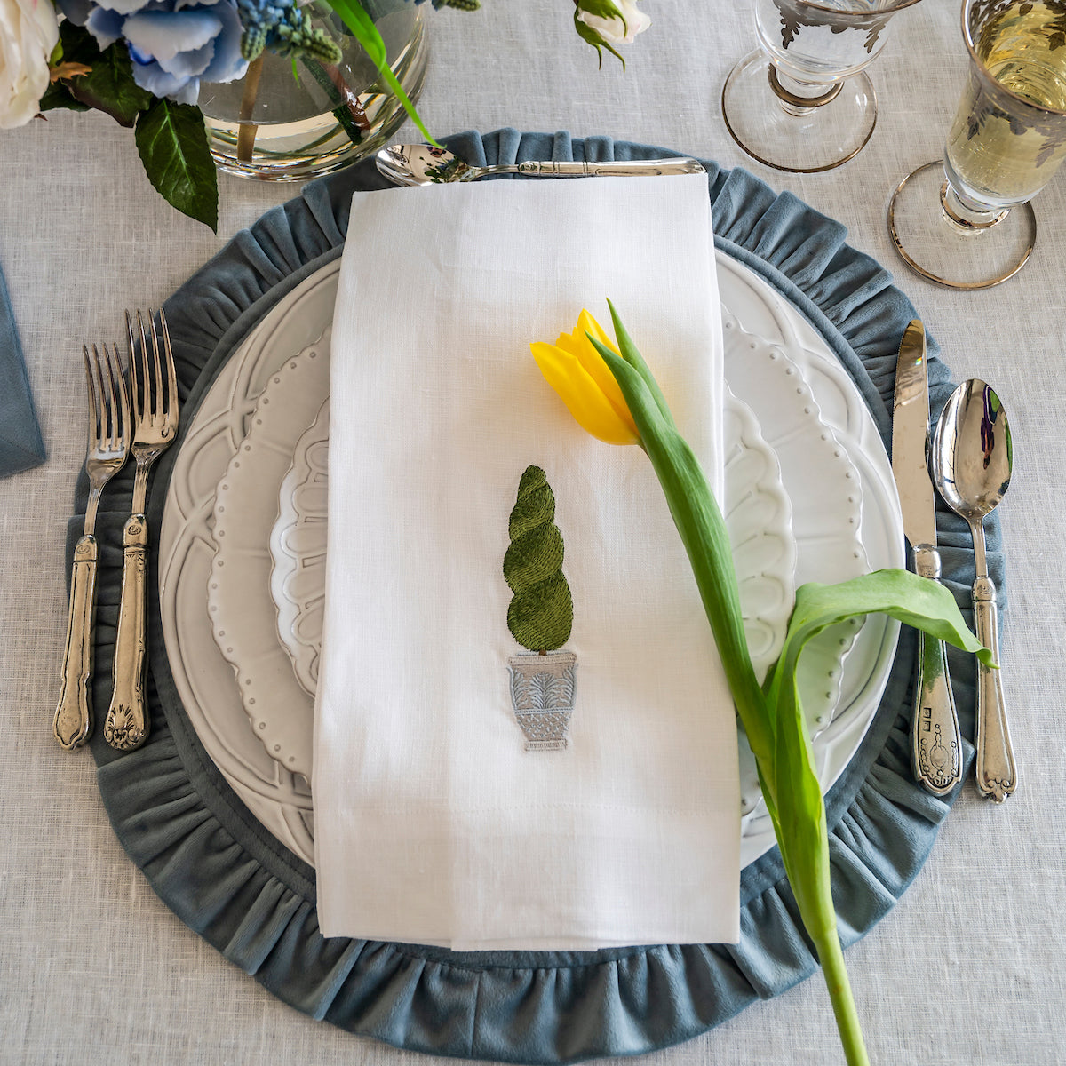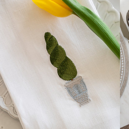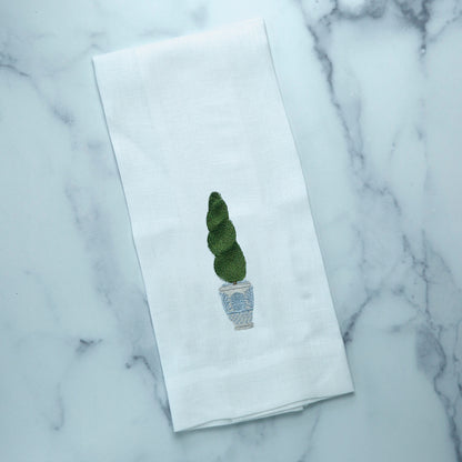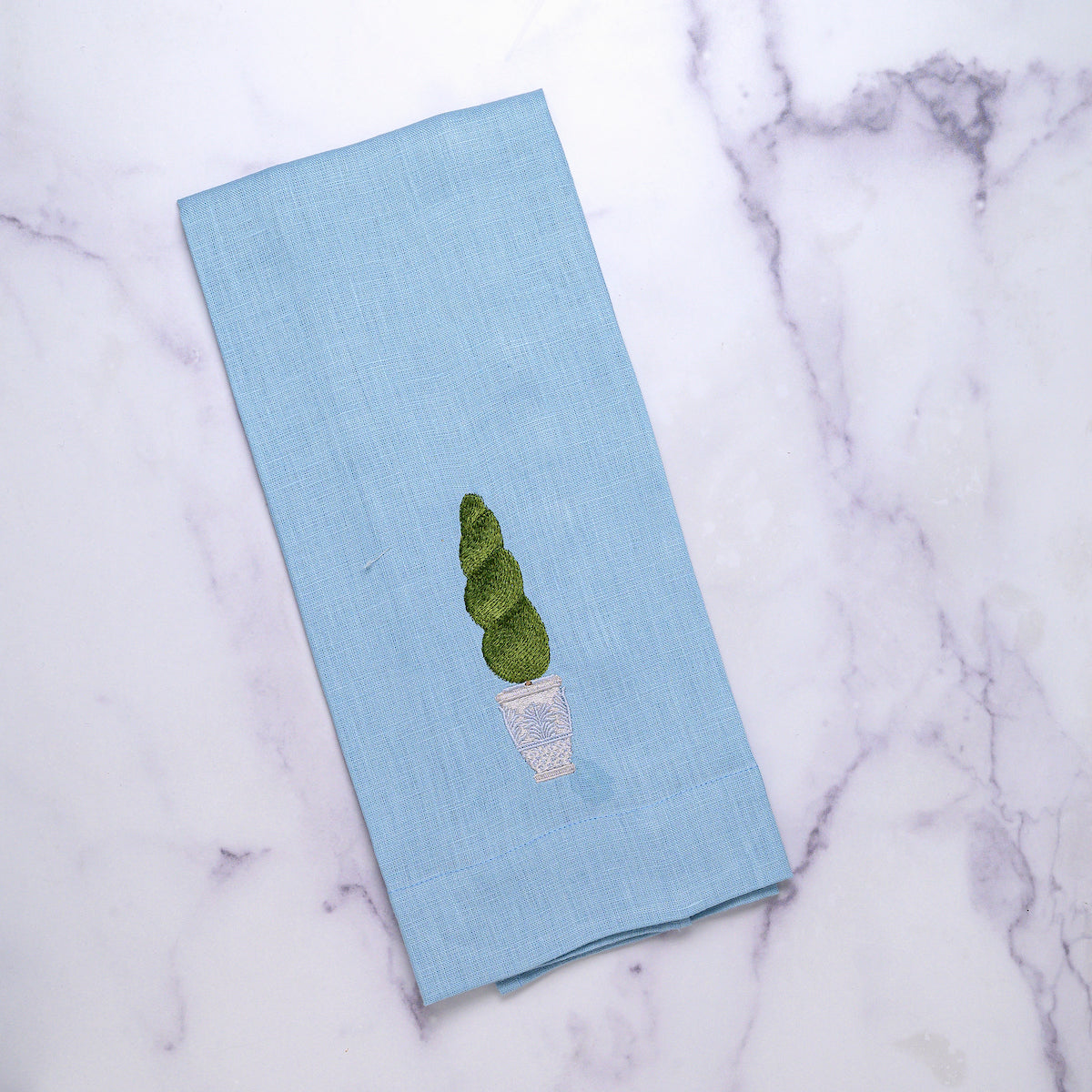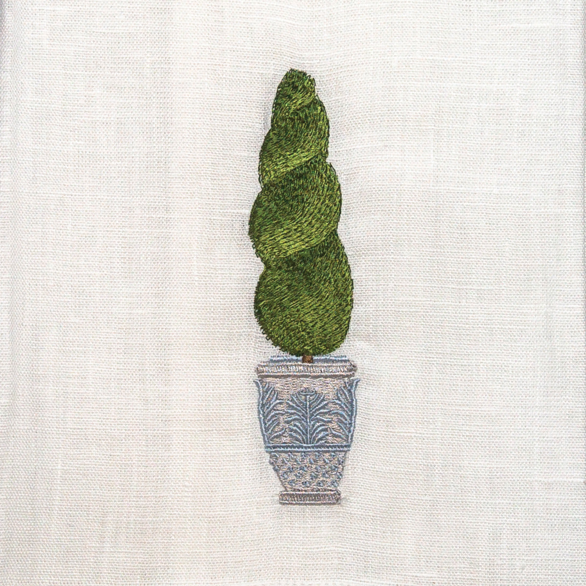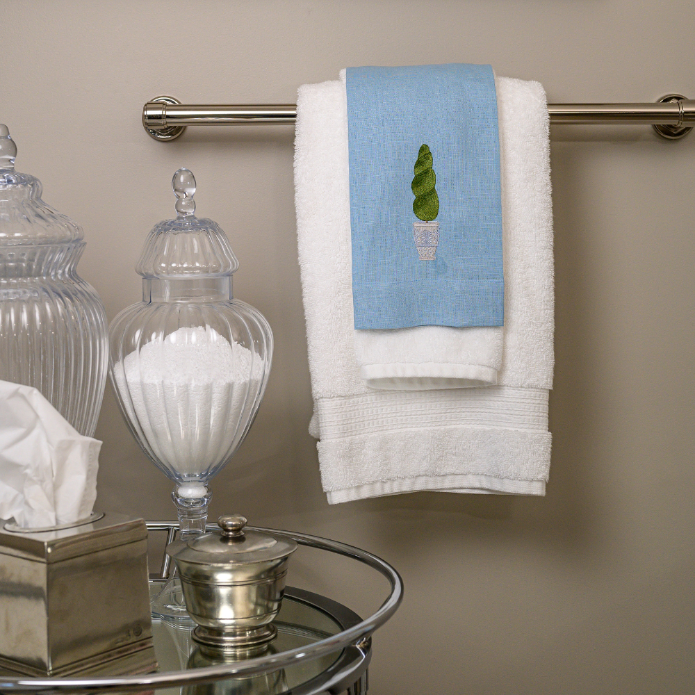 Dress up the kitchen or bath with this beautiful 100% European linen towel. Embroidered with a Spiral Topiary design, this towel adds beauty to any part of your home. Tab on back for hanging. Machine wash and iron flat for a crisp look.