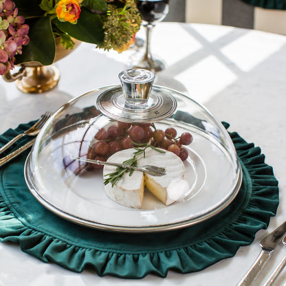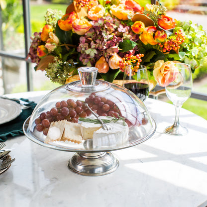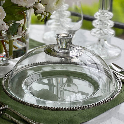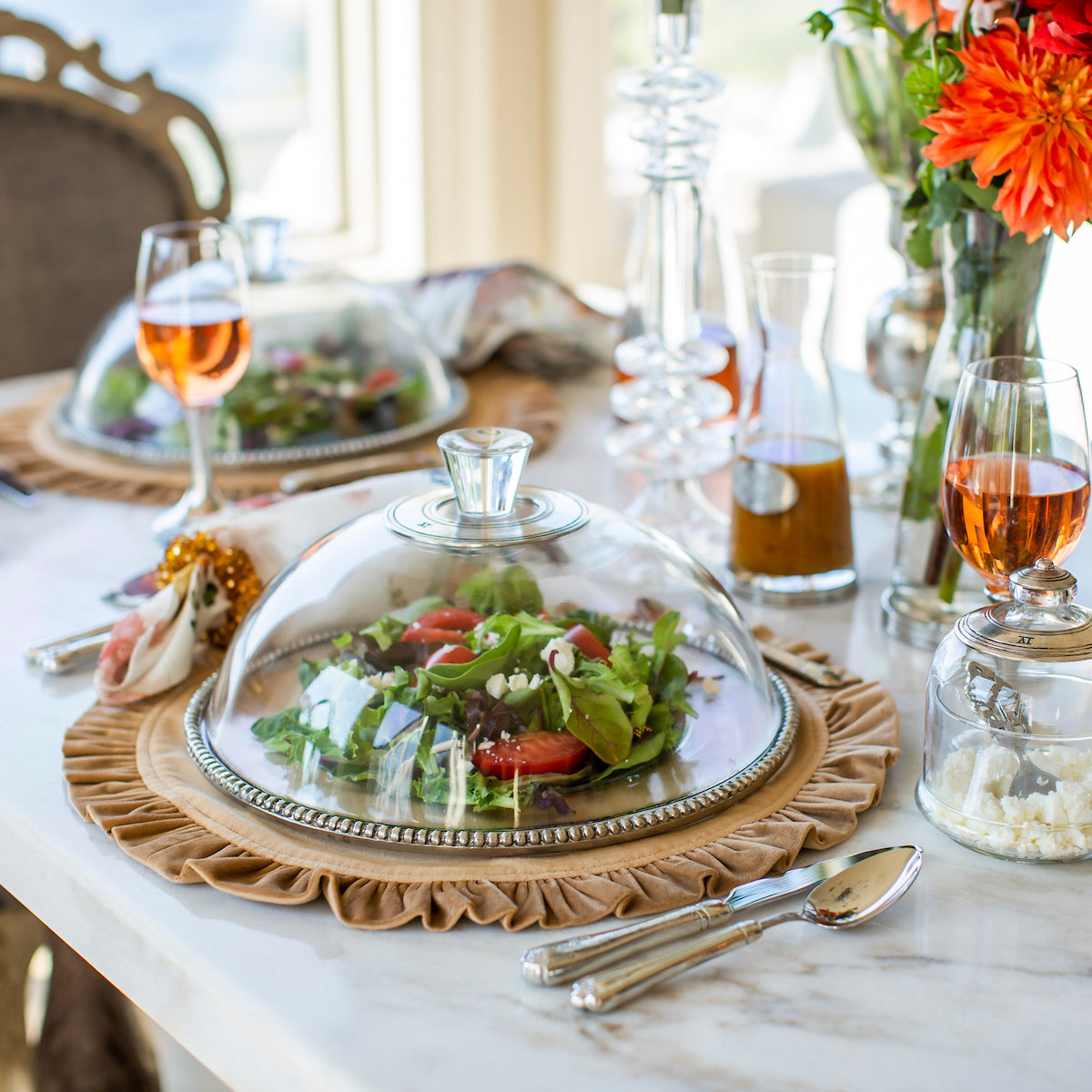 It is so lovely to dine el fresco, but often special equipment is needed. Our Tavola Glass Dome/Cloche protects your charcuterie, appetizers, salad, entree or desserts it high style. Fits perfectly on our Tesoro Charger, Tavola Wood Cheese Board and Tavola Glass Cake Stand.