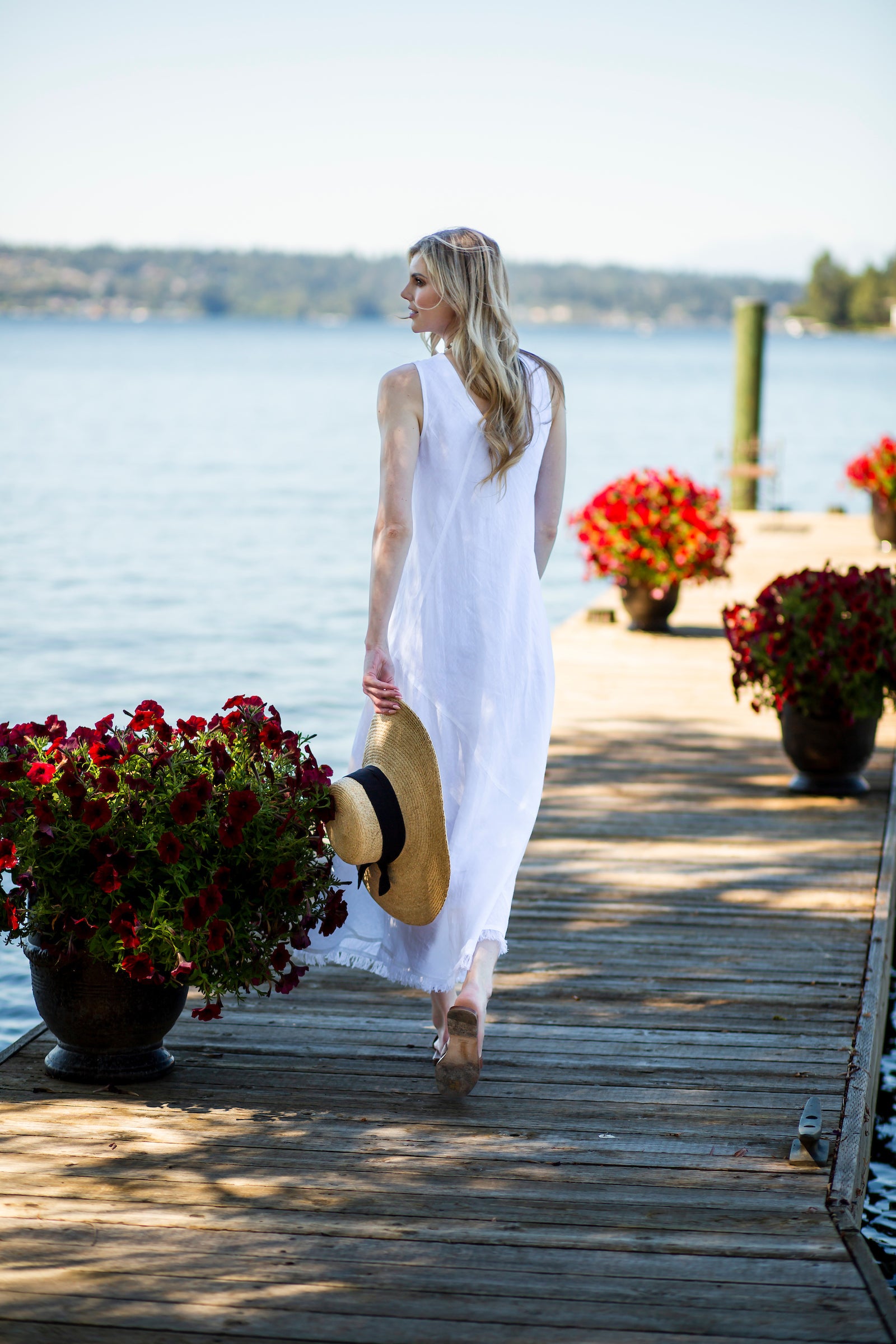 The Tawni dress is a beautiful sleeveless, bias-cut dress perfect for day and evening wear. Fun fringed hem on the white and black styles. Linen is the perfect heat regulator for warm days and an elegant fabric for all occasions. A perfect match with our Jessie Jacket in coordinating colors.
