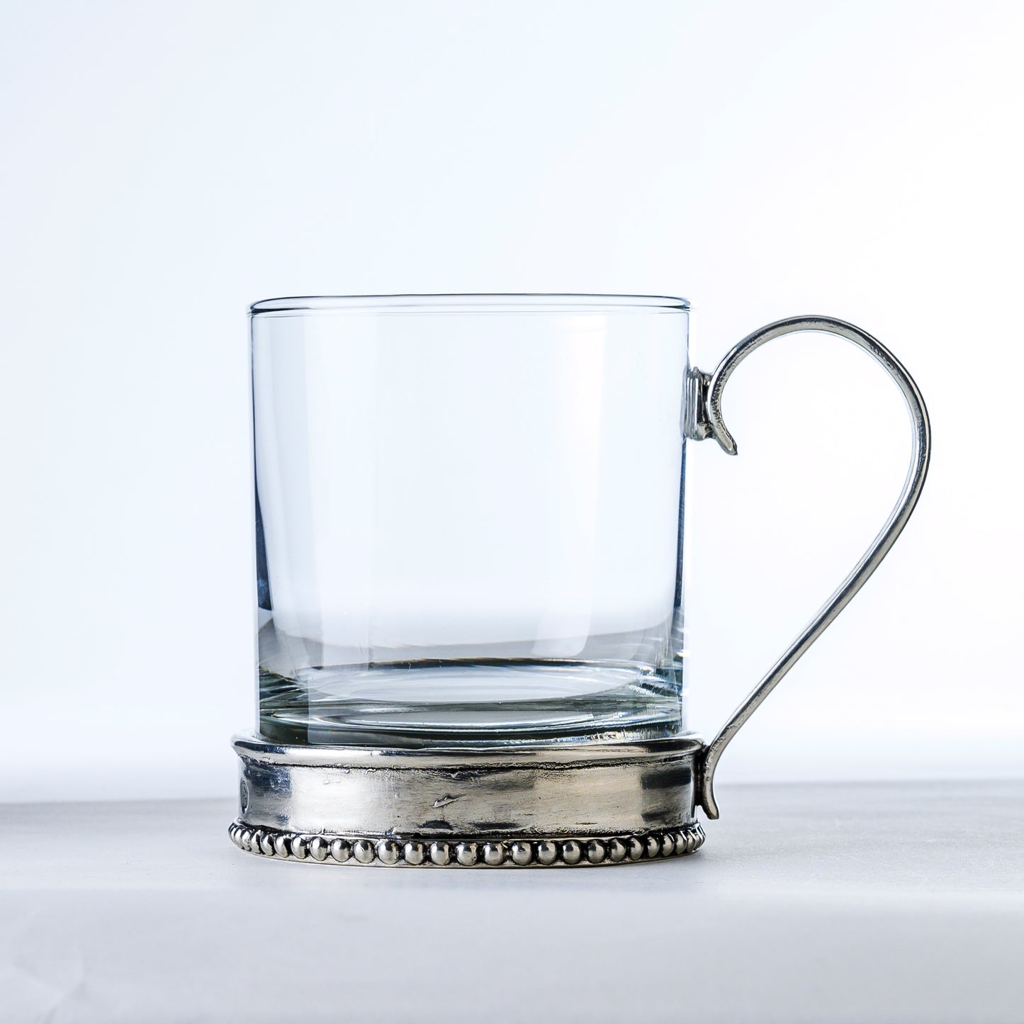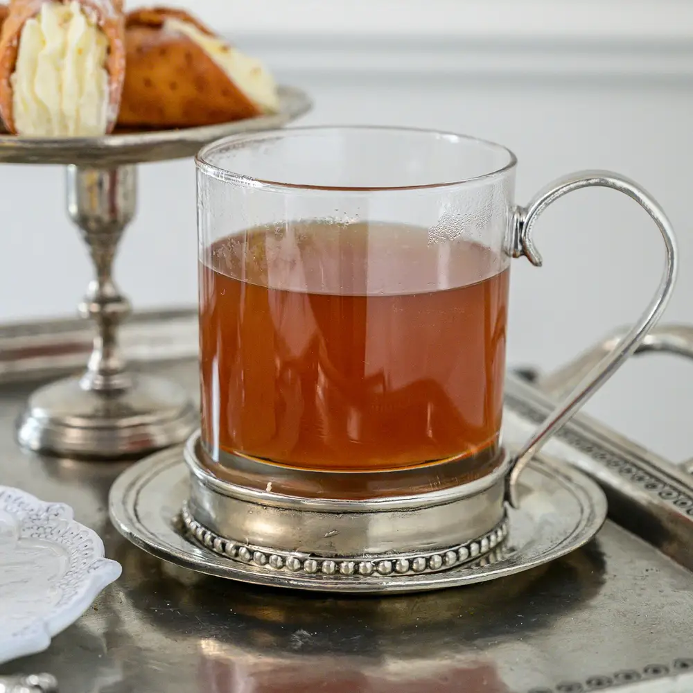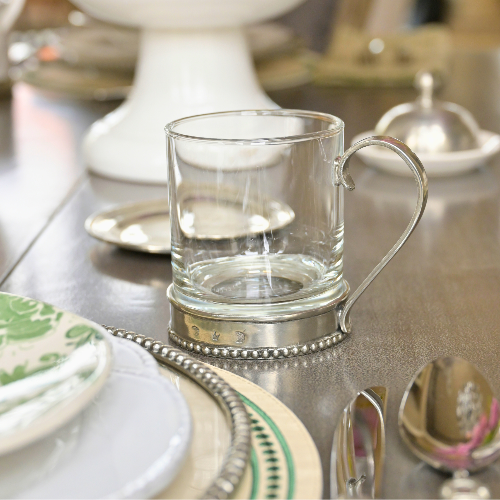 Glass and pewter pair beautifully once again in this new Tesoro Glass Mug. Elevate your morning routine. The delicate pewter base provides a striking contrast to the beaded rim, making it a work of art on your table. Savor your coffee or tea in style and sophistication with this elegant addition to your collection.